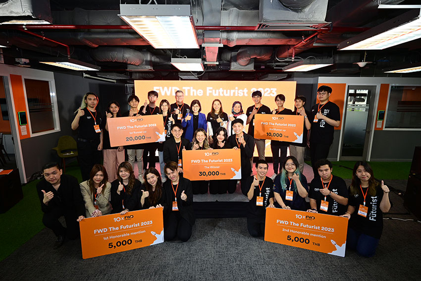 คณะผู้บริหาร บริษัท เอฟดับบลิวดี ประกันชีวิต จำกัด (มหาชน) (“FWD ประกันชีวิต”) มอบรางวัลชนะเลิศการแข่งขันโครงการ “FWD The Futurist 2023” ให้แก่ทีม Baiyoke Sky จากการนำเสนอผลงานในรอบชิงชนะเลิศ ณ อาคารสินธร 3 ถนนวิทยุ เมื่อเร็วๆนี้