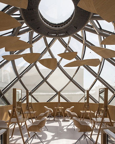 ทันทีที่มาถึง ผู้ที่มาเยี่ยมชมก็จะได้พบกับรูปแบบทางสถาปัตยกรรมที่เป็นเอกลักษณ์ นั่นคือหลังคากระจกสูง โค้ง รูปทรงรี ที่ตั้งอยู่ระหว่างกำแพงหิน แนวคิดในการใช้กระจกขนาดใหญ่และโครงเหล็กเป็นผลมาจากการคำนวณอย่างละเอียดครั้งแล้วครั้งเล่า องค์ประกอบเหล่านี้เกิดขึ้นได้ด้วยเทคโนโลยีและความร่วมมือกับเบลลาพาร์ต (Bellapart) ผู้นำระดับโลกด้านนวัตกรรมการก่อสร้างและสถาปัตยกรรมที่มีความซับซ้อน