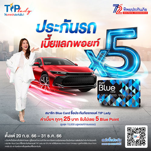 นายพลรัตน์ เอกโยคยะ รองกรรมการผู้จัดการใหญ่ ด้านการขายและการตลาด 2 นางสาวสุภาพ ประดับการ รองกรรมการผู้จัดการใหญ่ ด้านการขายและการตลาด 1 บริษัท ทิพยประกันภัย จำกัด (มหาชน) ผนึกกำลังกับ นางสาวชมพูนุท ดำรงเกียรติศักดิ์ ผู้จัดการส่วนบริหารความสัมพันธ์ลูกค้า บริษัท ปตท. น้ำมันและการค้าปลีก จำกัด (มหาชน) นางสาวภัทรธิรา บุณยะประดับ พนักงานวิเคราะห์และวางแผนส่วนบริหารความสัมพันธ์ลูกค้า บริษัท ปตท. น้ำมันและการค้าปลีก จำกัด (มหาชน) มอบสิทธิพิเศษสำหรับสมาชิก Blue Card โดยสมาชิกสามารถซื้อประกันภัยรถยนต์ TIP Lady จากทิพยประกันภัย ผ่านช่องทาง Blue Card Mobile Application , Website Bluecard , Application xplORe รับ Blue Point 5 เท่า (เดิม 25 บาท รับ 1 Blue Point , สูงสุด 15,000 บลูพอยท์/กรมธรรม์) พร้อมรับสิทธิ์ ผ่อนชำระ 0% สูงสุด 10 เดือน ผ่านบัตรเครดิตที่ร่วมรายการ*