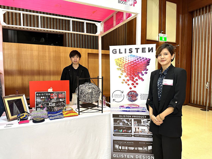 นางสาวจุฑามาศ บุญพงษ์ บริษัท กลิสเท็น ดีไซด์ จำกัด ตัวแทนทีมรางวัลรองชนะเลิศอันดับ 1 กล่าวว่า ไอเดียการทำผลิตภัณฑ์จาก Automotive Waste หรือ ขยะยานยนต์ มาจากการทำโปรเจคก่อนจบการศึกษาในระดับปริญญาตรี จากการศึกษาพบว่าปัญหาของขยะชนิดนี้ไม่สามารถนำมารีไซเคิลได้ จึงลองเอามาทำเป็นงานออกแบบเป็นเชิงเทกซ์ไทล์ เพื่อต่อยอดให้วัสดุดังกล่าวกลับมามีชีวิตชีวาอีกครั้ง อย่างไรก็ตามรู้สึกเกินคาดมากที่ได้รับรางวัลจากธนาคารออมสิน เพราะเข้าร่วมโครงการฯเป็นปีแรก ส่วนเงินรางวัลที่ได้จะแบ่งเป็น 50-30-20 โดยส่วนแรกจะนำไป Develop ตัวของ Material รวมถึงเทคนิคของงานช่างฝีมือ ให้มีความซับซ้อนขึ้น ผลิตงานได้เร็วขึ้น อีก 30% จะทำเรื่อง Production เช่น ทำคลิปวีดีโอ ถ่ายแบบ และอยากลองเปิดหน้าร้านจริงจังเพิ่มส่วน 20% สุดท้าย จะเก็บเป็นทุนสำรองไว้สำหรับใช้ในอนาคต สุดท้ายนี้อยากขอบคุณโครงการนี้ที่ให้โอกาสเข้ามาร่วมโครงการ รู้สึกตื่นเต้นและดีใจมากที่ได้พบปะผู้ประกอบการที่หลากหลาย ได้เรียนรู้ทั้งในกลุ่มใหญ่และกลุ่มย่อย นอกจากนี้ยังได้ประสบการณ์เพิ่มขึ้น ถ้ามีโอกาสอยากเข้าร่วมอีกครั้ง
