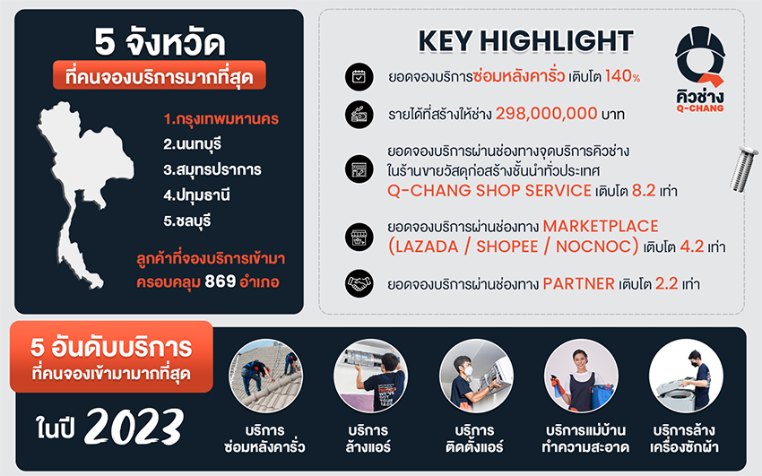 เผยภาพรวมปี 2023 ที่ผ่านมา ยอดจองบริการโตพุ่ง 2 เท่า บริการ ‘ซ่อมหลังคารั่ว’ เติบโตกว่า 140% ครองอันดับ 1 บริการยอดนิยม ในด้านช่างสร้างรายได้ให้ช่างไปกว่า 298,000,000 บาทพร้อมพัฒนาบริการและมาตรฐานช่าง รวมถึงขยายตลาดการจองบริการช่าง ไปในช่องทางที่หลากหลายมากขึ้นเพื่อให้เข้าถึงกลุ่มลูกค้าเจ้าของบ้านมากยิ่งขึ้นและเพิ่มโอกาสในการสร้างรายได้และอาชีพให้ช่างทั่วประเทศ พร้อมแบ็คอัพทุกเรื่องบ้าน WE’VE GOT YOUR BACK