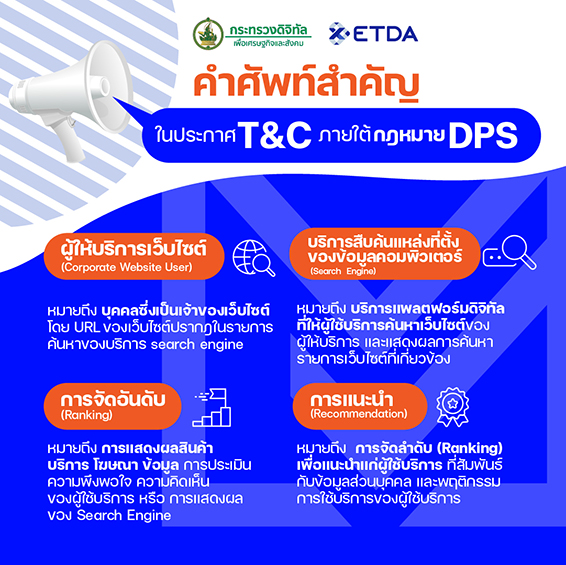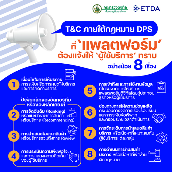 นายชัยชนะ มิตรพันธ์ ผู้อำนวยการ ETDA เปิดเผยว่า ตามที่ กฎหมาย DPS (Digital Platform Service) หรือ พ.ร.ฎ.การประกอบธุรกิจบริการแพลตฟอร์มดิจิทัล ที่ต้องแจ้งให้ทราบ พ.ศ. 2565 มาตรา 17 ได้กำหนดให้ผู้ประกอบธุรกิจแพลตฟอร์มดิจิทัล ที่มีลักษณะบริการตาม มาตรา 16 คือ เป็นบริการแพลตฟอร์มที่มีลักษณะให้บริการโดยคิดค่าบริการ, ให้บริการเป็นสื่อกลางในการเสนอสินค้าหรือบริการ, ผู้ประกอบธุรกิจมีสัญญากับผู้ประกอบการในการเสนอสินค้าหรือบริการ หรือเป็นบริการ Search engine หรือ เป็นบริการสืบค้นแหล่งที่ตั้งของข้อมูลคอมพิวเตอร์ จะต้องดำเนินการแจ้งให้ผู้ใช้บริการทราบเกี่ยวกับ "ข้อตกลงและเงื่อนไขการให้บริการ (Terms & Conditions: T&C)” ก่อนหรือขณะใช้บริการ