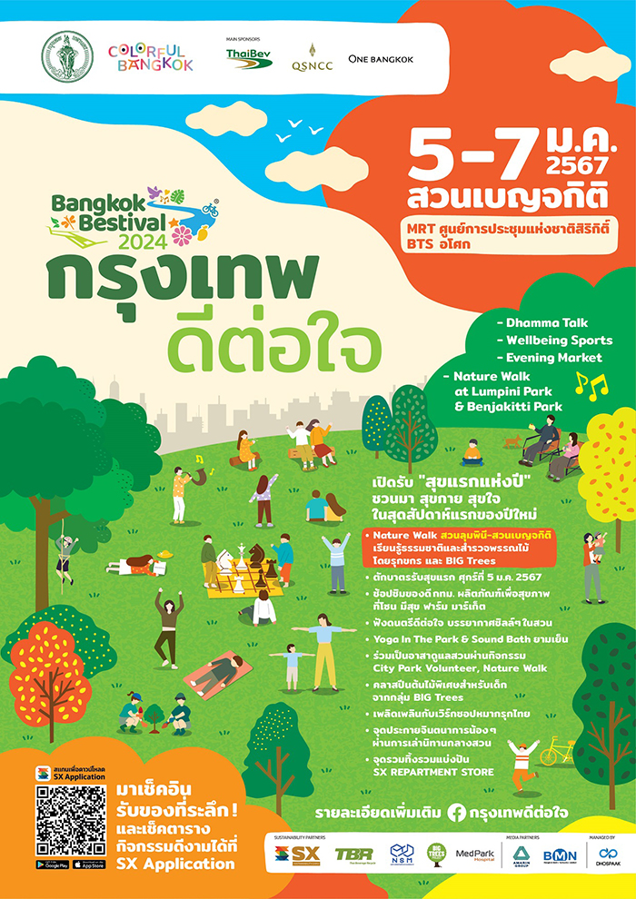 ศูนย์การประชุมแห่งชาติสิริกิติ์ ร่วมกับ กรุงเทพมหานคร ภาคเอกชน และเครือข่ายเพื่อความยั่งยืน นำโดย บริษัท ไทยเบฟเวอเรจ จำกัด (มหาชน) และวันแบงค็อก เพื่อมอบ “สุขแรก” เป็นของขวัญสุดพิเศษให้คนกรุงเทพฯ รับวัน “ศุกร์แรก” ของปีใหม่ ด้วยเทศกาล “กรุงเทพ ดีต่อใจ” ส่งเสริมคุณภาพชีวิตที่ดีให้คนกรุงเทพฯ ได้สุขใจ สุขกายไปกับ 11 กิจกรรมตลอดทั้ง 3 วัน ตั้งแต่วันที่ 5-7 มกราคม 2567 ณ สวนเบญจกิติ โดยไม่เสียค่าใช้จ่าย