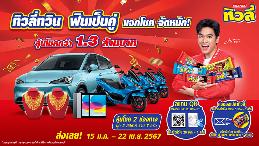 กิจกรรม “แจกโชค จัดหนัก ทิวลี่ทวิน ฟินเป็นคู่” ลุ้นโชคกว่า 1.3 ล้านบาท ได้แก่ รางวัลใหญ่ รถยนต์ไฟฟ้า NETA V 1 รางวัล, มอเตอร์ไซค์ Honda PCS160 พร้อมบัตรน้ำมัน มูลค่า 1,000 บาท รวม 4 รางวัล, iPad 10 64gb แจกเป็นคู่ รางวัลละ 2 เครื่อง รวม 7 รางวัล, สร้อยคอทองคำ 1 สลึง แจกเป็นคู่ รางวัลละ 2 เส้น รวม 14 รางวัล และบัตรเติมเงินทรูมันนี่มูลค่า 500 บาท แจกเป็นคู่ รางวัลละ 2 ใบ รวม 70 รางวัล รวมทั้งสิ้น 96 รางวัล สามารถร่วมสนุกผ่านช่องทางที่ 1 : ส่งซองเปล่าทิวลี่ รสใดขนาดใดก็ได้ 5 ซอง เขียนชื่อ ที่อยู่ และเบอร์โทรศัพท์ ส่งมาที่ตู้ปณ.99 ปณศ. นนทบุรี 11000 ช่องทางที่ 2 : ซื้อสินค้าทิวลี่ (รสใดขนาดใดก็ได้) มูลค่า 20 บาท เท่ากับ 1 สิทธิ์ สแกน QR code ตามสื่อโฆษณาประชาสัมพันธ์ หรือเพิ่มเพื่อนทางไลน์ @TivoliTH ลงทะเบียน และแนบรูปถ่ายใบเสร็จเพื่อยืนยันรับสิทธิ์ลุ้นโชค สามารถส่งชิ้นส่วนผลิตภัณฑ์มาร่วมสนุกได้ตามช่องทางการเข้าร่วมกิจกรรม และแลกแต้มเพื่อรับสิทธิ์ลุ้นรางวัลได้ตั้งแต่วันที่15 มกราคม 2567 – วันที่ 22 เมษายน 2567 นี้ ติดตามทุกความเคลื่อนไหวของแคมเปญ “แจกโชค จัดหนัก ทิวลี่ทวิน ฟินเป็นคู่” ได้ที่เพจเฟซบุ๊ก "Tivoli ทิวลี่" ทาง https://www.facebook.com/TivoliThailand