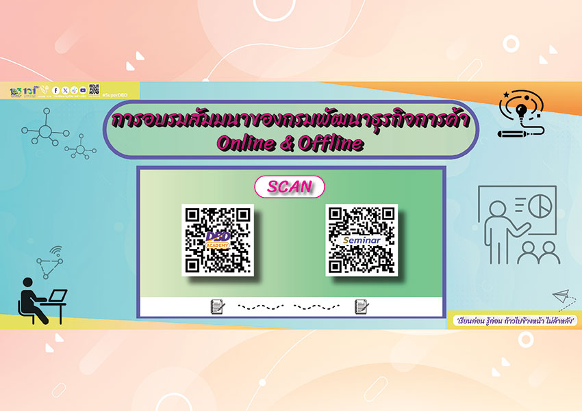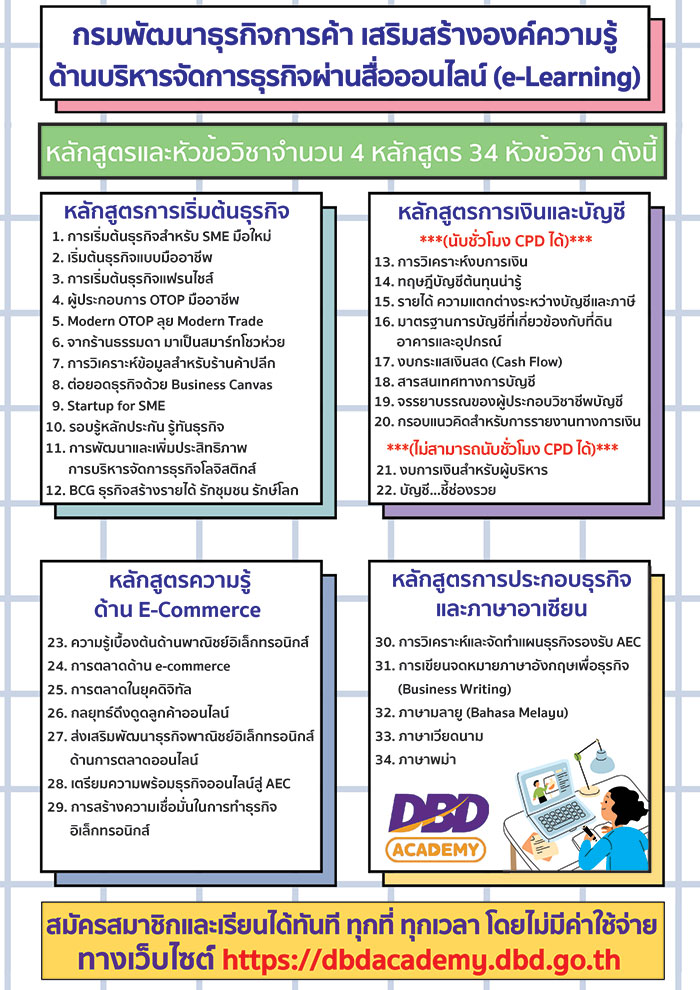 กรมพัฒนาธุรกิจการค้า พร้อมเคียงข้างเป็นเพื่อนคู่คิดผู้ประกอบธุรกิจโดยไม่ทิ้งใครไว้ข้างหลัง พร้อมร่วมสร้างเครือข่ายธุรกิจให้เอสเอ็มอีมีพันธมิตรทางการค้าที่คอยเกื้อกูล ส่งเสริม สนับสนุน และต่อยอดธุรกิจร่วมกัน ล่าสุดได้สร้างสรรค์องค์ความรู้ใหม่ๆ ที่มีความจำเป็นต่อการประกอบธุรกิจ ทั้งการบริหารจัดการ การตลาด การเงินและบัญชี และความรู้รอบตัวเรื่องอื่นๆ ภายใต้หลักสูตรการเรียนรู้นวัตกรรมวิทยาการผ่านช่องทางออนไลน์และออฟไลน์ที่มีกว่า 70 หัวข้อวิชา ให้ผู้ประกอบการเอสเอ็มอีได้เลือกเรียนรู้ตามความชื่นชอบ/ตามประเภทธุรกิจ และเรียนรู้ได้ตลอดทั้งปี