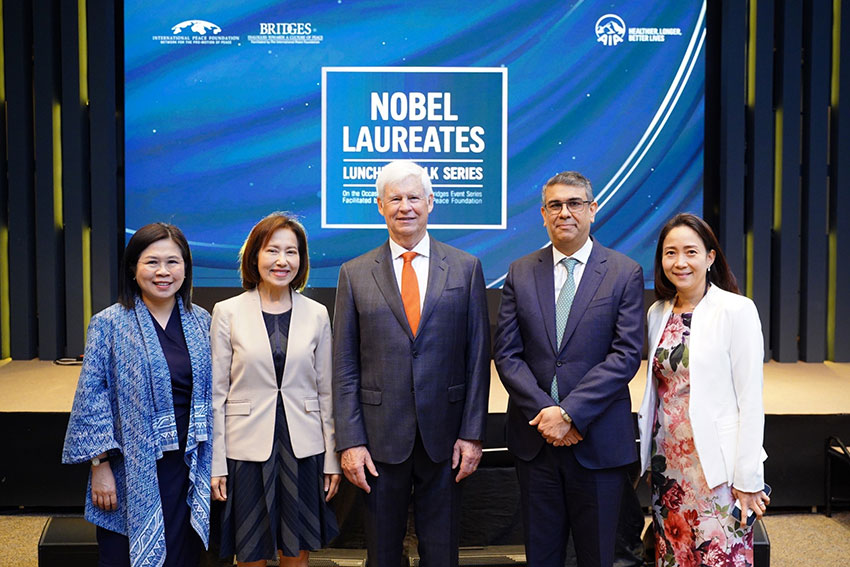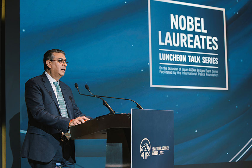 นายนิคฮิล แอดวานี ประธานเจ้าหน้าที่บริหาร เอไอเอ ประเทศไทย กล่าวว่า “เอไอเอ มีความยินดีเป็นอย่างยิ่งที่ได้จัดงานอันทรงคุณค่าอย่าง AIA Nobel Laureates Luncheon Talk Series เป็นครั้งที่ 2 ซึ่งถือเป็นการตอกย้ำถึงเป้าหมายของเราที่ต้องการสร้างการมีส่วนร่วมกับสังคมและผู้คนอย่างน้อยหนึ่งพันล้านคนให้มีสุขภาพและชีวิตที่ดีขึ้นภายในปี 2573 แน่นอนว่าปัญหาการเปลี่ยนแปลงสภาพภูมิอากาศ หรือ Climate change ได้กลายเป็นหนึ่งในความเสี่ยงหลักที่ส่งผลกระทบต่อชุมชนและเศรษฐกิจโลก ในฐานะที่เอไอเอเป็นบริษัทประกันชีวิตอันดับหนึ่ง ที่นอกจากจะมอบความคุ้มครองด้านชีวิตและสุขภาพแล้ว เรายังเป็นองค์กรที่มุ่งมั่นด้าน ESG มาอย่างต่อเนื่องผ่านการลงทุนในหุ้น พันธบัตร และอสังหาริมทรัพย์ที่เป็นมิตรต่อสิ่งแวดล้อม พร้อมกันนั้นเรายังตั้งเป้าลดการปล่อยก๊าซเรือนกระจกสุทธิเป็นศูนย์ (Net Zero) ภายในปี 2593 เพื่อแสดงถึงความเป็นผู้นำด้าน ESG ในภูมิภาคเอเชีย แปซิฟิก ตลอดจนทำให้เอไอเอสามารถดูแลลูกค้า ชุมชน และสังคม รวมถึงประเทศชาติได้อย่างยั่งยืน