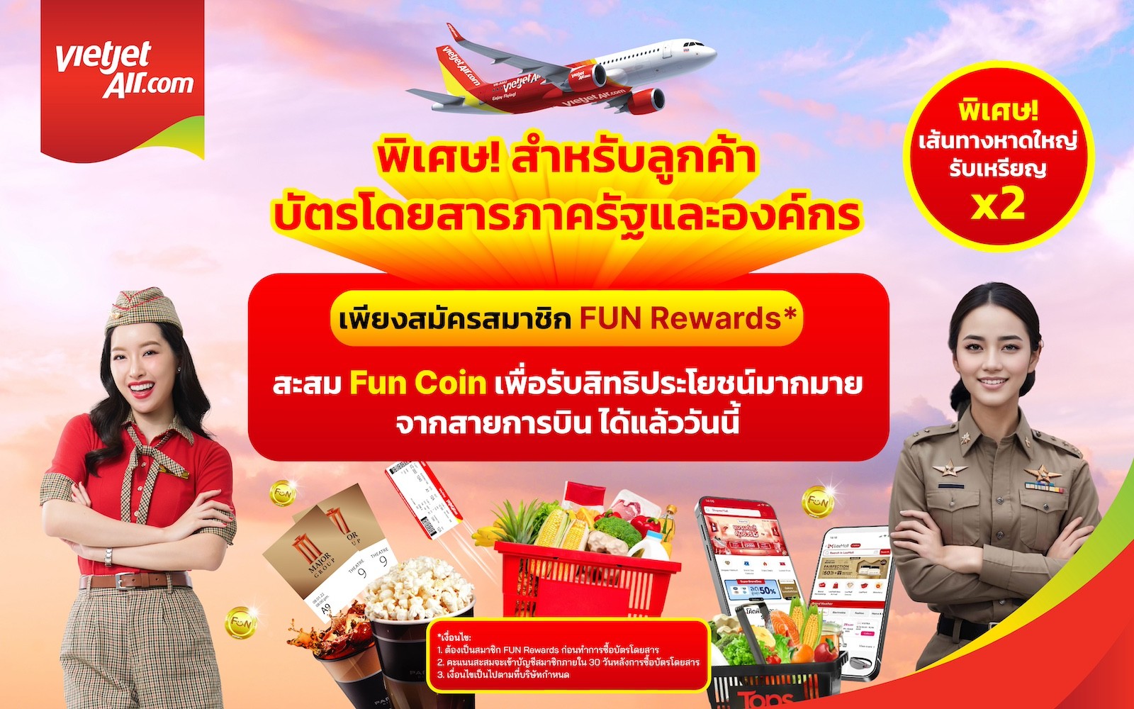 เวียตเจ็ทไทยแลนด์ยกระดับสิทธิประโยชน์สำหรับผู้โดยสารภาครัฐและองค์กร ด้วยแคมเปญสะสมเหรียญ Fun Coin สำหรับสมาชิก Fun Rewards เริ่มตั้งแต่วันที่ 1 กรกฎาคม 2568 ผู้โดยสารที่จองบัตรโดยสารภาครัฐและองค์กรผ่านห้องจำหน่ายบัตรโดยสารของเวียตเจ็ทไทยแลนด์ ตัวแทนจำหน่ายทั่วประเทศ หรือช่องทางจำหน่ายอย่างเป็นทางการ สามารถสะสมเหรียญ Fun Coin ได้ทันที ยิ่งเดินทางมาก ยิ่งสะสมได้มาก พร้อมแลกรับสิทธิประโยชน์สุดคุ้ม อาทิ ส่วนลดบัตรโดยสารครั้งถัดไปและสิทธิพิเศษจากพันธมิตรมากมาย ในราคาสุดคุ้มเริ่มต้นเพียง 1,680 บาท (รวมภาษีและค่าธรรมเนียม) พร้อมรับสิทธิ์โหลดสัมภาระและเข้าใช้ห้องรับรองพิเศษ* เพื่อความสะดวก คุ้มค่า และประทับใจตลอดการเดินทางเพื่อปฏิบัติหน้าที่