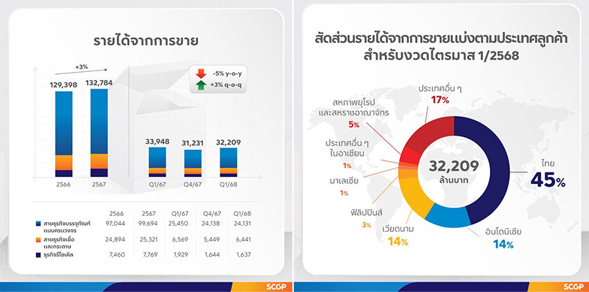 SCGP มุ่งเน้นการขายภายในประเทศภูมิภาคอาเซียน เพื่อตอบสนองความต้องการใช้บรรจุภัณฑ์ที่เพิ่มขึ้น เพิ่มสัดส่วนกลุ่มบรรจุภัณฑ์อุปโภคบริโภค รวมถึงปรับกลยุทธ์การส่งออกกระดาษบรรจุภัณฑ์ไปยังประเทศต่าง ๆ ในอาเซียน เอเชียใต้ และตะวันออกกลาง นอกจากนี้ SCGP สามารถเพิ่มประสิทธิภาพในการลดต้นทุนด้วยการใช้เทคโนโลยีปัญญาประดิษฐ์ (AI) และ Machine Learning รวมถึงการจัดการต้นทุนพลังงานและวัตถุดิบกระดาษรีไซเคิล (RCP) ที่มีประสิทธิภาพ ทำให้ผลการดำเนินงานไตรมาสที่ 1 ของปี 2568 มีรายได้จากการขาย 32,209 ล้านบาท เพิ่มขึ้นร้อยละ 3 เมื่อเทียบกับไตรมาสก่อน มี EBITDA เท่ากับ 4,232 ล้านบาท เพิ่มขึ้นร้อยละ 49 เมื่อเทียบกับไตรมาสก่อน และมีกำไรสำหรับงวด 900 ล้านบาท เพิ่มขึ้นเมื่อเทียบกับไตรมาสก่อน