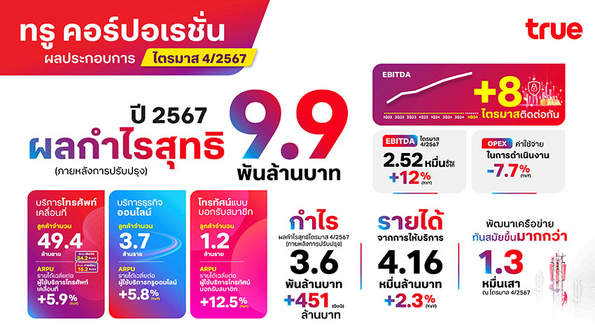 บริษัท ทรู คอร์ปอเรชั่น จำกัด (มหาชน) รายงานผลประกอบการไตรมาส 4/2567 สร้างกำไรต่อเนื่อง โดยมีกำไรสุทธิหลังหักภาษีและหลังปรับปรุงรายการพิเศษ (Normalized Net Profit After Tax) ที่ 3.6 พันล้านบาท โดย EBITDA เติบโตเพิ่มขึ้นเป็นไตรมาสที่ 8 ติดต่อกัน โดยมีปัจจัยหลักจากการลดลงของค่าใช้จ่ายในการดำเนินงาน จากการมุ่งเน้นผลการดำเนินงานและวินัยทางการเงิน ตลอดจนการรับรู้ผลประโยชน์จากการควบรวม (Synergy) รายได้จากการให้บริการและ EBITDA สูงกว่าแนวโน้มที่ตั้งไว้สำหรับปี 2567