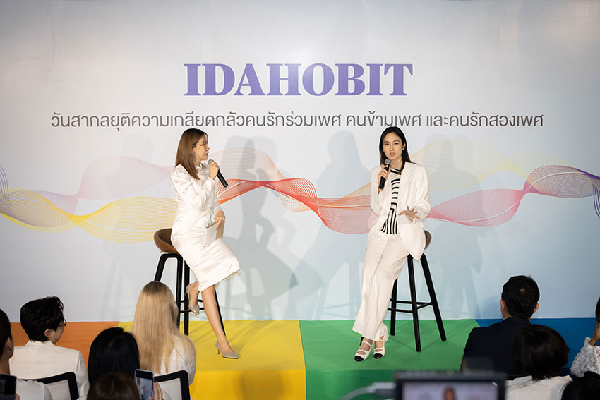 บมจ.กรุงไทย-แอกซ่า ประกันชีวิต นำโดย คุณแซลลี่ โอฮาร่า ประธานเจ้าหน้าที่บริหาร แอกซ่า ภูมิภาคเอเชียอาคเนย์ และประเทศเกาหลีใต้ (คนซ้าย) และ คุณบุปผาวดี โอวรารินท์ ประธานเจ้าหน้าที่บริหาร ฝ่ายทรัพยากรบุคคลและภาพลักษณ์องค์กรและการสื่อสารองค์กร (คนขวา) ร่วมรณรงค์วันสากลยุติความเกลียดกลัวคนรักเพศเดียวกัน คนรักสองเพศ คนหลากหลายทางเพศ และคนข้ามเพศ (IDAHOBIT) เพื่อส่งเสริมความเท่าเทียมกันในที่ทำงาน พร้อมผลักดันให้มีสภาพแวดล้อมในการทำงานที่ทุกคนสามารถเป็นตัวของตัวเองได้อย่างอิสระ และไม่มีข้อจำกัด ผ่านกิจกรรม “IDAHOBIT ปลดปล่อยความเป็นตัวคุณบนพื้นที่ปลอดภัย” ภายใต้ธีมของปีนี้ คือ “Together Always: United in Diversity รวมกันเป็นหนึ่ง เพื่อความแตกต่างที่หลากหลาย” เพื่อเป็นการตอกย้ำว่าทุกคนมีสิทธิในการแสดงออกทางเพศของตนได้อย่างอิสระ โดยปราศจากความรุนแรงทางจิตใจหรือร่างกาย