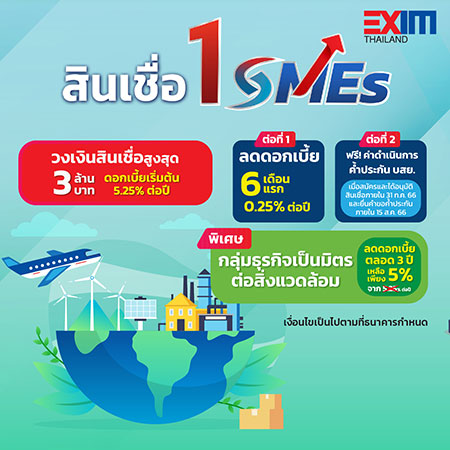 • สินเชื่อเอ็กซิมเติมทุนส่งออก (EXIM Export Ready Credit) วงเงินสูงสุด 20 ล้านบาท ดอกเบี้ยเริ่มต้น 25% ต่อปี พิเศษ! ธุรกิจเป็นมิตรต่อสิ่งแวดล้อม ลดดอกเบี้ยปีแรก เหลือเพียง 4% ต่อปี