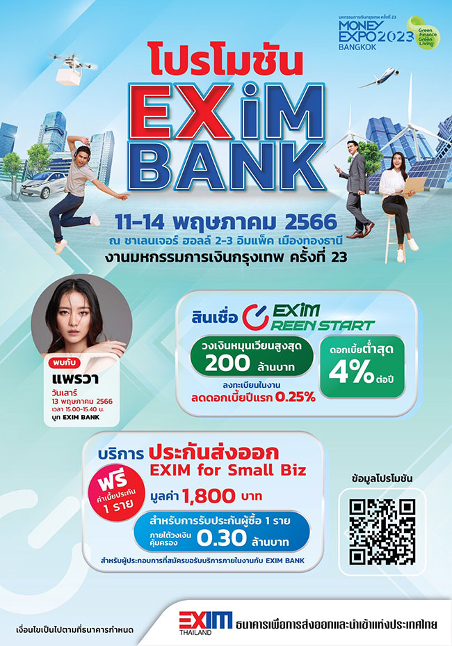 ธนาคารเพื่อการส่งออกและนำเข้าแห่งประเทศไทย (EXIM BANK) ขอเชิญผู้ประกอบการและผู้สนใจเยี่ยมชมบูท EXIM BANK (บูท H7) รูปแบบ “สวนหลังบ้านเพื่อความยั่งยืน (Sustainability Urban Courtyard)” ในงาน “มหกรรมการเงินกรุงเทพ ครั้งที่ 23 (Money Expo 2023)” ระหว่างวันที่ 11-14 พฤษภาคม 2566 ณ อาคารชาเลนเจอร์ ฮอลล์ 2-3 อิมแพ็ค เมืองทองธานี พบกับ “คลินิก EXIM เพื่อคนตัวเล็ก” เพื่อรับคำปรึกษาทางการเงิน แก้หนี้ และเติมทุนให้แก่ผู้ประกอบการ SMEs และบุคคลทำธุรกิจที่สนใจจะเริ่มต้นหรือขยายธุรกิจส่งออก ด้วยแพ็กเกจจัดเต็มพร้อมโปรโมชันพิเศษโดยเฉพาะธุรกิจเป็นมิตรกับสิ่งแวดล้อม