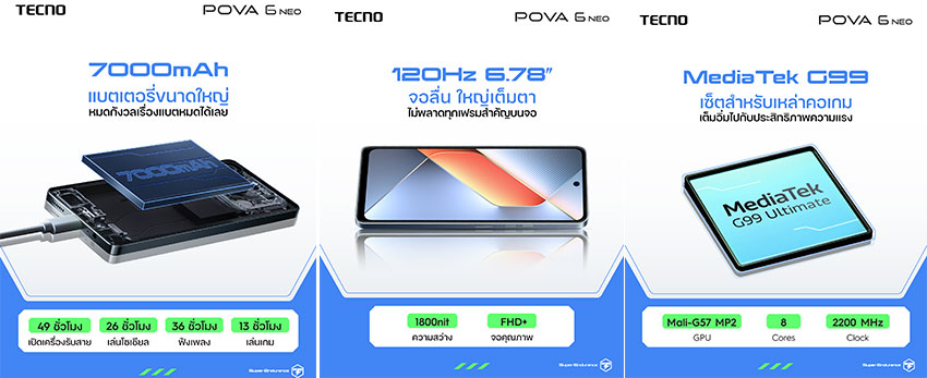 TECNO ผู้นำด้านสมาร์ตโฟนสำหรับการเล่นเกม เตรียมเปิดตัว TECNO POVA 6 NEO สมาร์ตโฟนที่พร้อมพาคุณทะยานสู่ความเหนือระดับอย่างทรงพลังและการใช้งานที่ยาวนานมากขึ้น มาพร้อมกับสโลแกน “แบตอึด ยิ่งกว่าที่เคย” ด้วยขนาดแบตเตอรี่ 7000mAh ที่จะทำให้คุณหมดห่วงเรื่องแบตหมดระหว่างวัน ไม่ว่าจะเล่นเกม ดูหนัง ฟังเพลง หรือใช้งานอย่างเต็มที่ พร้อมรองรับทุกความต้องการของคุณ ด้วยราคาเบาๆ ไม่เกิน 6,000 บาท!