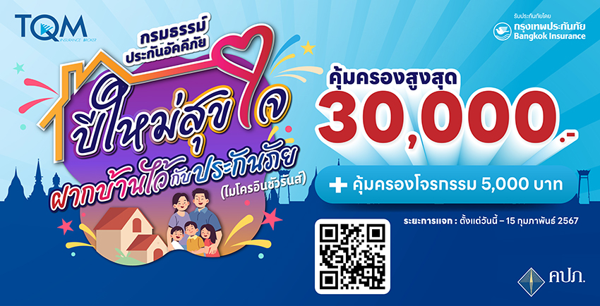 ดร.นภัสนันท์ พรรณนิภา ประธานเจ้าหน้าที่บริหาร บริษัท ทีคิวเอ็ม อินชัวร์รันส์ โบรคเกอร์ จำกัด กล่าวว่า TQM ได้ร่วมมือกับพันธมิตร บริษัท กรุงเทพประกันภัย จำกัด (มหาชน) ส่งเสริมความคุ้มครองประกันภัยในช่วงเทศกาลปีใหม่ 2567 มอบฟรีกรมธรรม์ประกันภัยกลุ่มปีใหม่เที่ยวได้อุ่นใจ (ไมโครอินชัวรันส์) ให้ความคุ้มครองสูงสุด 100,000 บาท และกรมธรรม์ประกันอัคคีภัยที่อยู่อาศัยปีใหม่สุขใจฝากบ้านไว้กับประกัน (ไมโครอินชัวรันส์) ที่ให้ความคุ้มครองสูงสุด 30,000 บาท จำนวน 200,000 กรมธรรม์ คุ้มครอง 30 วัน เพื่อช่วยบรรเทาความสูญเสียเบื้องต้นหากเกิดอุบัติเหตุ ในระหว่างการเดินทาง หรือบ้านถูกโจรกรรม หรือเกิดไฟไหม้ TQM จึงขอเป็นส่วนหนึ่งในการร่วมส่งคนไทยได้กลับบ้านหรือท่องเที่ยว เพื่อใช้ชีวิตพักผ่อนกับครอบครัวและคนที่รัก แบบสุขใจ และยังเป็นการส่งเสริมให้ประชนเข้าถึงความคุ้มครองด้านประกันภัยเพิ่มขึ้นอีกด้วย โดยมีระยะการรับสิทธิ์ ตั้งแต่วันนี้ - 15 ก.พ. 67