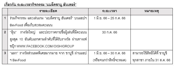 เข้าสู่โค้งสุดท้ายอย่างเป็นทางการ !!! “ชาบูชิ” (SHABUSHI) ท้าแฟน ๆ ชาบูชิ และเหล่านักกิน สายเกมเมอร์ส พิชิตภารกิจสุดพิเศษส่งท้ายกิจกรรม เกม “แบล็คชาบู ฮันเตอร์” (BLACK SHABU HUNTER) ล่า – ลุ้น – แลก ทองคำแท่งและรางวัลมากมาย รวมมูลค่ากว่า 1,000,000 บาท* พร้อมเปิดเกม “ล่า” ไอเทมวัตถุดิบพิเศษในเมนูซีรีส์ แบล็คชาบู ได้แก่ สันคอหมูคุโรบูตะ หมูเด้งสาหร่าย ลูกชิ้นเอ็นหมู เส้นเล็ก เส้นราเมน เส้นคูซูคิริ ผักบุ้ง และ ใบโหระพา ลากลงหม้อชาบู – ชาบู ให้ถูกต้องเพื่อเก็บสะสมคะแนน (ตั้งแต่ 1 มิถุนายน 2566 – 25 กรกฎาคม 2566) โดยผู้ที่มีคะแนนสะสมสูงสุด 10 อันดับแรก “ลุ้น” รางวัลใหญ่ ได้แก่ รางวัลทองคำแท่ง มูลค่าน้ำหนัก 3 บาท จำนวน 1 รางวัล (สำหรับผู้ที่มีคะแนนสะสมสูงสุดอันดับ 1) รางวัลทองคำแท่ง มูลค่าน้ำหนัก 1 บาท จำนวน 1 รางวัล (สำหรับผู้ที่มีคะแนนสะสมสูงสุดอันดับ 2) และรางวัลกินชาบูชิฟรีตลอดปี* จำนวน 8 รางวัล (สำหรับผู้ที่มีคะแนนสะสมสูงสุดอันดับ 3 – 10) (ประกาศรายชื่อผู้ที่ได้รับรางวัล 30 กรกฎาคม 2566 บน WWW.FACEBOOK.COM/OISHIGROUP) หรือใช้คะแนนสะสมตามที่กำหนด “แลก” รางวัลส่วนลดพิเศษมากมาย ซึ่งมีให้เลือกหลากหลายรายการ ดังนี้ คูปอง “กินฟรี” (สำหรับ 1 ท่าน) คูปอง “มา 2 จ่าย 1” คูปอง “มา 4 จ่าย 3” คูปอง “ส่วนลด 50 บาท” หรือ คูปอง “ส่วนลด 20 บาท” (ตั้งแต่ 1 มิถุนายน 2566 – 30 กรกฎาคม 2566 หรือจนกว่าสิทธิ์จะครบตามจำนวน)