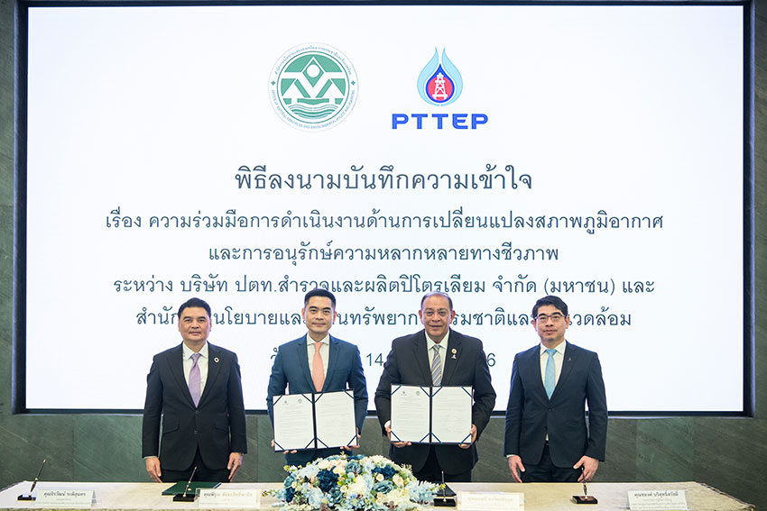 นายมนตรี ลาวัลย์ชัยกุล ประธานเจ้าหน้าที่บริหาร บริษัท ปตท.สำรวจและผลิตปิโตรเลียม จำกัด (มหาชน) หรือ ปตท.สผ. และนายพิรุณ สัยยะสิทธิ์พานิช เลขาธิการสำนักงานนโยบายและแผนทรัพยากรธรรมชาติและสิ่งแวดล้อม หรือ สผ. ร่วมลงนามบันทึกความเข้าใจเกี่ยวกับความร่วมมือ ในการดำเนินงานด้านการเปลี่ยนแปลงสภาพภูมิอากาศและการอนุรักษ์ความหลากหลายทางชีวภาพ เพื่อสนับสนุนและขับเคลื่อนการดำเนินการด้านการเปลี่ยนแปลงสภาพภูมิอากาศ ซึ่งเป็นส่วนหนึ่งที่จะช่วยให้ประเทศไทยบรรลุเป้าหมายความเป็นกลางทางคาร์บอนและมุ่งไปสู่สังคมคาร์บอนต่ำ ควบคู่ไปกับการอนุรักษ์ ฟื้นฟู ทรัพยากรธรรมชาติและความหลากหลายทางชีวภาพ รวมถึง การเชื่อมโยงแลกเปลี่ยนข้อมูลความหลากหลายทางชีวภาพในระดับพื้นที่ไปยังฐานข้อมูลของประเทศไทย เช่น การส่งเสริมการดำเนินงานของภาคเอกชนในโครงการดักจับ ใช้ประโยชน์ และกักเก็บก๊าซคาร์บอนไดออกไซด์ (Carbon Capture, Utilization and Storage หรือ CCUS) การเพิ่มการคุ้มครองความหลากหลายทางชีวภาพนอกเขตพื้นที่อนุรักษ์ตามกฎหมาย และการฟื้นฟูและอนุรักษ์พันธุ์พืช พันธุ์สัตว์ที่ถูกคุกคาม เป็นต้น ความร่วมมือดังกล่าวยังรวมถึงการสนับสนุนกิจกรรมการมีส่วนร่วมระหว่างภาครัฐและเอกชนในระดับประเทศ ภูมิภาคและนานาชาติ และการเสริมสร้างความตระหนักรู้แก่สาธารณะอีกด้วย