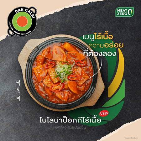 บริษัท ดัคกาลบี้ กรุ๊ป จํากัด ผู้ดำเนินธุรกิจร้านอาหารภายใต้แบรนด์ DAK GALBI, DGB, GALBI X และ WOK Station เปิดตัวเมนูอาหารจากแพลนต์เบส (Plant Based) จากแบรนด์ Meat Zero นวัตกรรมเนื้อสัตว์จากพืช ให้เนื้อสัมผัสและรสชาติเสมือนเนื้อจริง ปราศจากคอเลสเตอรอลและมีโปรตีนสูง เอาใจผู้บริโภคยุคใหม่ และคนที่ดูแลสุขภาพ รวมถึงกลุ่มผู้บริโภคมังสวิรัติ ให้เลือกรับประทานหลากหลายรสชาติ ทั้งแบบไทยและเกาหลี