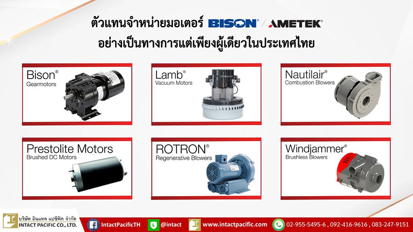 บริษัท อินแทค แปซิฟิค จำกัด ผู้นำเข้าและตัวแทนจำหน่ายสินค้าอุตสาหกรรมคุณภาพสูงที่ได้รับการแต่งตั้งอย่างเป็นทางการจาก BISON หน่วยธุรกิจในเครือของบริษัท AMETEK (สหรัฐอเมริกา) ในการเป็นผู้จัดจำหน่ายแต่เพียงผู้เดียวในประเทศไทยจาก 6 แบรนด์ชั้นนำในระดับสากลที่มีชื่อเสียงมายาวนานกว่าร้อยปี ได้แก่ แบรนด์ Lamb®, Windjammer®, Nautilair®, Prestolite, ROTRON®, และ BISON® (ตามที่ได้รับอนุมัติสำหรับปี 2025) เพื่อให้บริการลูกค้าในธุรกิจอุตสาหกรรมทั้งโรงงานผู้ผลิต งานตรวจวัดคุณภาพสิ่งแวดล้อม ธุรกิจบริการทำความสะอาด รวมไปถึงผู้ใช้ผลิตภัณฑ์คุณภาพจาก BISON เป็นส่วนประกอบหลักของอุปกรณ์และเครื่องจักรต่างๆ ตอกย้ำความเป็นผู้นำตลาดด้วยการนำเสนอผลิตภัณฑ์คุณภาพสูงครอบคลุมประเทศไทย