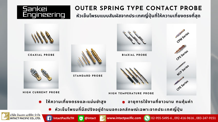 3) Contact Probe - หัวเข็มโพรบแบบสัมผัส จาก Sankei Engineering ประเทศญี่ปุ่น โดดเด่นด้วยการออกแบบที่เป็นเอกลักษณ์เฉพาะด้วยการมีสปริงอยู่ด้านนอกตัวโพรบ (Outer Spring type contact probes) หนึ่งในคุณสมบัติหลักของโพรบชนิดนี้ ทำให้ไฟฟ้ากระแสสูงสามารถไหลผ่านโครงสร้างของโพรบได้ การนำหัวเข็มโพรบที่ขึ้นรูปเป็นชิ้นเดียวนี้ไปใช้กับวงจรไฟฟ้า ทำให้ลดความผิดพลาดในการวัดค่าไฟฟ้าได้ และสามารถวัดความต้านทานได้อย่างแม่นยำและเที่ยงตรง หัวเข็มโพรบแบบมีสปริงอยู่ด้านนอกของ Sankei Engineering ใช้กันเป็นที่แพร่หลายกับงานที่ต้องการกระแสไฟฟ้าสูง เช่น การชาร์จและการคายประจุแบตเตอรี่ ยิ่งไปกว่านั้น ยังเป็นที่นิยมใช้ในกระบวนการผลิตอิเล็กทรอนิกส์มาตรฐานสูง ไม่เพียงแต่ในอุตสาหกรรมยานยนต์ แต่ยังรวมถึงเครื่องใช้ไฟฟ้า อิเล็กทรอนิกส์ เครื่องจักร และอุปกรณ์ทางการแพทย์ อีกด้วย