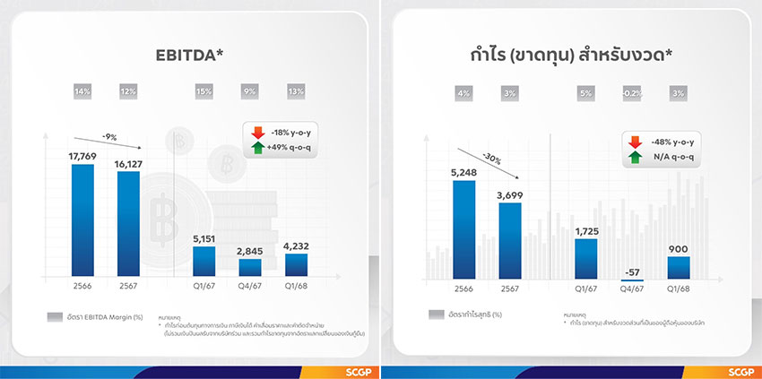 SCGP มุ่งเน้นการขายภายในประเทศภูมิภาคอาเซียน เพื่อตอบสนองความต้องการใช้บรรจุภัณฑ์ที่เพิ่มขึ้น เพิ่มสัดส่วนกลุ่มบรรจุภัณฑ์อุปโภคบริโภค รวมถึงปรับกลยุทธ์การส่งออกกระดาษบรรจุภัณฑ์ไปยังประเทศต่าง ๆ ในอาเซียน เอเชียใต้ และตะวันออกกลาง นอกจากนี้ SCGP สามารถเพิ่มประสิทธิภาพในการลดต้นทุนด้วยการใช้เทคโนโลยีปัญญาประดิษฐ์ (AI) และ Machine Learning รวมถึงการจัดการต้นทุนพลังงานและวัตถุดิบกระดาษรีไซเคิล (RCP) ที่มีประสิทธิภาพ ทำให้ผลการดำเนินงานไตรมาสที่ 1 ของปี 2568 มีรายได้จากการขาย 32,209 ล้านบาท เพิ่มขึ้นร้อยละ 3 เมื่อเทียบกับไตรมาสก่อน มี EBITDA เท่ากับ 4,232 ล้านบาท เพิ่มขึ้นร้อยละ 49 เมื่อเทียบกับไตรมาสก่อน และมีกำไรสำหรับงวด 900 ล้านบาท เพิ่มขึ้นเมื่อเทียบกับไตรมาสก่อน