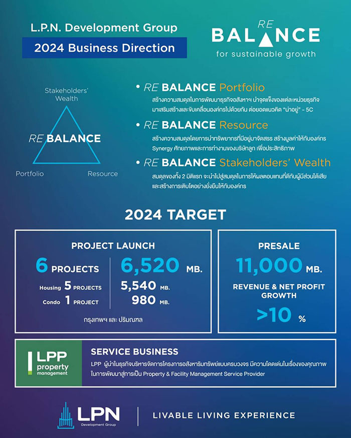 แอล.พี.เอ็น. เดินหน้าสร้างสมดุลในการบริหารพอร์ต ทั้งการลงทุนพัฒนาโครงการที่อยู่อาศัย และสร้างธุรกิจใหม่ เพื่อรักษาอัตราการเติบโตอย่างยั่งยืนขององค์กร ในปี 2567 ภายใต้การนำทัพของ “อภิชาติ เกษมกุลศิริ” ประธานเจ้าหน้าที่บริหารคนใหม่
