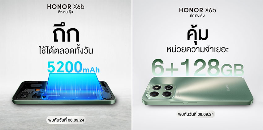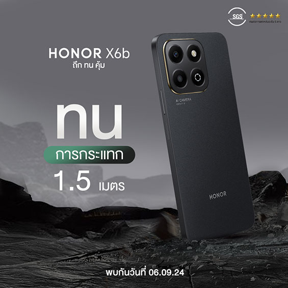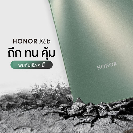 ห้ามพลาด! เตรียมสัมผัสประสบการณ์การใช้งานที่ยาวนานและทนทาน กับสมาร์ตโฟนรุ่นใหม่ล่าสุด HONOR X6b เตรียมเปิดราคาอย่างเป็นทางการในประเทศไทยในวันที่ 5 กันยายน 2567 พร้อมเริ่มจำหน่ายตั้งแต่วันที่ 6 กันยายน 2567 เป็นต้นไป พร้อมรับโปรโมชันสุดพิเศษมากมาย!