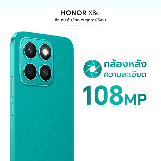 หนึ่งในไฮไลต์ที่ทำให้ HONOR X8c โดดเด่นเหนือสมาร์ตโฟนรุ่นอื่นในระดับเดียวกัน คือ ระบบกล้องอัจฉริยะที่ช่วยให้ทุกการถ่ายภาพเป็นเรื่องง่าย โดยกล้องหลักของ HONOR X8c มีความละเอียดสูงสุดถึง 108MP (f/1.75) และกล้อง Depth & Wide ความละเอียด 5MP (f/2.2) ที่ช่วยเก็บมิติภาพอย่างเป็นธรรมชาติและเต็มไปด้วยรายละเอียด โดยกล้องหลัก 108MP ให้ผู้ใช้ถ่ายภาพได้อย่างละเอียดสูงสุดและสามารถบันทึกวิดีโอได้ที่ความละเอียดสูงถึง 1080P (Full HD) พร้อมฟีเจอร์การซูมดิจิตอลสูงสุดถึง 8 เท่า ซูมได้แบบไม่สูญเสียรายละเอียด สีสันคมชัดสมจริง