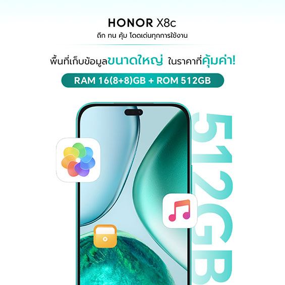 HONOR X8c มาพร้อมพื้นที่เก็บข้อมูลภายในขนาดใหญ่ถึง 512GB ช่วยให้จัดเก็บไฟล์ได้จุใจ รองรับภาพถ่ายมากกว่า 120,000 ภาพ และเพลงกว่า 48,000 เพลง โดยไม่ต้องกังวลว่าพื้นที่จะเต็มเร็วเกินไป ทั้งยังสามารถใช้งานสมาร์ตโฟนได้อย่างสะดวกสบาย โดยไม่ต้องคอยลบไฟล์เก่า หรือย้ายข้อมูลไปยังพื้นที่เก็บอื่นบ่อย ๆ