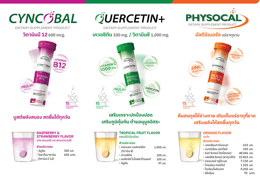 โดยผลิตภัณฑ์เสริมอาหารรูปแบบเม็ดฟู่ใหม่ล่าสุด ออกแบบมาเพื่อการดูแลสุขภาพแบบครบทุกมิติ ตอบโจทย์วิถีชีวิตคนยุคใหม่ที่ต้องการทั้งความสะดวกและสุขภาพที่แข็งแรงในทุก ๆ วัน จำนวน 3 สูตร ได้แก่ Quercetin+ รสทรอปิคัลฟรุ๊ต ที่ผสานเควอซิติน วิตามินซี 1,000 มล. และไบโอฟลาโวนอยด์จากส้ม ช่วยเสริมภูมิคุ้มกัน บำรุงการทำงานของปอด ต้านอนุมูลอิสระ พร้อมช่วยส่งเสริมการปกป้องระบบทางเดินหายใจจากฝุ่น PM 2.5 เหมาะสำหรับทุกเพศทุกวัย โดยเฉพาะผู้ที่ต้องการเสริมภูมิคุ้มกันและสุขภาพปอด, Cyncobal รสราสเบอร์รี่-สตรอว์เบอร์รี่ อุดมด้วยวิตามินบี12 และอินูลิน มีส่วนช่วยบำรุงระบบประสาทและสมอง ป้องกันโรคอัลไซเมอร์ สมองเสื่อม และอาการอ่อนเพลียเรื้อรัง เหมาะสำหรับทุกเพศทุกวัย โดยเฉพาะผู้ที่ต้องการเสริมความจำ และบำรุงสมอง และ Physocal รสส้ม ดื่มง่าย ที่ผสานมัลติ-มิเนอรัลหลากหลายชนิด ช่วยรักษาสมดุลของแร่ธาตุในร่างกาย เสริมพลังงาน ลดอาการอ่อนเพลีย ช่วยควบคุมระบบเผาผลาญ และช่วยปลดล็อกศักยภาพของร่างกายให้พร้อมรับทุกความท้าทายในแต่ละวัน เหมาะสำหรับทุกเพศทุกวัย โดยเฉพาะผู้ที่ต้องการเสริมแร่ธาตุเพื่อสุขภาพที่สมดุล