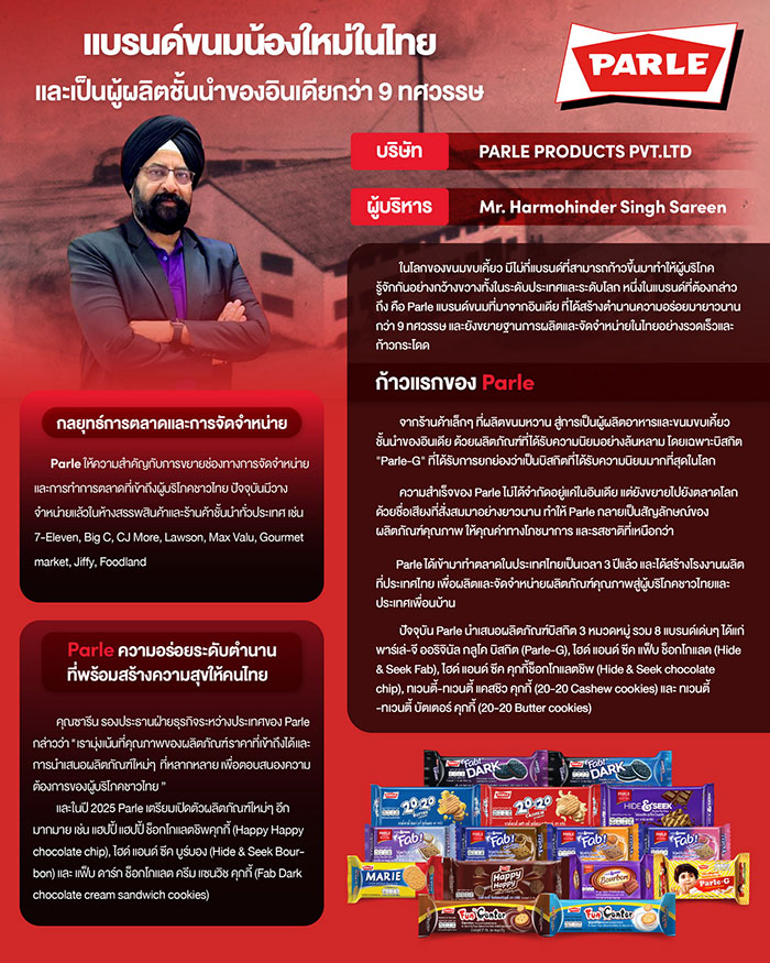 มร.ฮาร์โมฮินเดอร์ ซิงห์ ซารีน (Mr. Harmohinder Singh Sareen) รองประธานฝ่ายธุรกิจระหว่างประเทศ บริษัท พาร์เล่ โปรดักส์ จำกัด (PARLE PRODUCTS PVT.LTD) ผู้ผลิตขนมแบรนด์พาร์เล่ (Parle) แบรนด์ขนมขบเคี้ยวของอินเดีย กล่าวว่า “จุดเริ่มต้นของ Parle มาจากร้านค้าเล็ก ๆ ที่ผลิตขนมหวานสู่การเป็นผู้ผลิตอาหารและขนมขบเคี้ยวชั้นนำของอินเดียที่มีประวัติยาวนานกว่า 90 ปี ด้วยผลิตภัณฑ์ที่ได้รับความนิยมอย่างล้นหลาม โดยเฉพาะบิสกิต ‘Parle-G’ ที่ได้รับการยกย่องว่าเป็นบิสกิตที่ได้รับความนิยมมากที่สุดในโลก ความสำเร็จของ Parle ไม่ได้จำกัดอยู่แค่ในอินเดียแต่ยังขยายไปยังตลาดโลก ด้วยชื่อเสียงที่สั่งสมมาอย่างยาวนาน ทำให้ Parle กลายเป็นสัญลักษณ์ของผลิตภัณฑ์คุณภาพ ให้คุณค่าทางโภชนาการและรสชาติที่เหนือกว่า ปัจจุบัน Parle ได้เข้ามาทำตลาดในประเทศไทยเป็นเวลา 3 ปี และได้สร้างโรงงานผลิตที่ทันสมัยในประเทศไทย เพื่อการผลิตและจัดจำหน่ายผลิตภัณฑ์คุณภาพสู่ผู้บริโภคชาวไทยและประเทศเพื่อนบ้าน รวมถึงยังให้ความสำคัญกับการขยายช่องทางการจัดจำหน่ายและการทำการตลาดที่เข้าถึงผู้บริโภคชาวไทยมากขึ้นอีกด้วย”