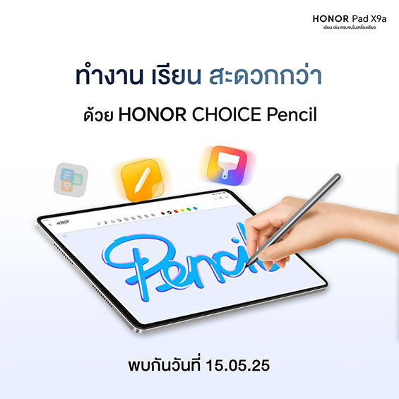 ออเนอร์ (HONOR) ผู้นำด้านอุปกรณ์อัจฉริยะระดับโลก เตรียมเปิดตัว HONOR Pad X9a แท็บเล็ตรุ่นใหม่ล่าสุดที่รองรับการใช้งานเทียบเท่าระดับ PC ตอบโจทย์การใช้งานทั้งการทำงานและความบันเทิง โดยจุดเด่นของรุ่นนี้คือการรองรับ HONOR Choice Pencil ปากกาอัจฉริยะที่ช่วยยกระดับประสบการณ์การจด เขียน หรือวาดภาพได้อย่างลื่นไหลและแม่นยำ พร้อมหน้าจอขนาดใหญ่ 11.5 นิ้ว ความละเอียดระดับ 2.5K และอัตราการรีเฟรช 120Hz ที่รองรับการถนอมสายตา เหมาะสำหรับการใช้งานต่อเนื่องยาวนาน ทั้งยังให้หน่วยความจำขนาดใหญ่ถึง 16(8+8)GB และพื้นที่จัดเก็บข้อมูล 128GB เพื่อรองรับทุกการทำงานและความบันเทิงอย่างเต็มพิกัด เตรียมพบกับการเปิดราคาอย่างเป็นทางการในประเทศไทย 15 พฤษภาคม 2568 พร้อมรับโปรโมชันและข้อเสนอพิเศษมากมาย