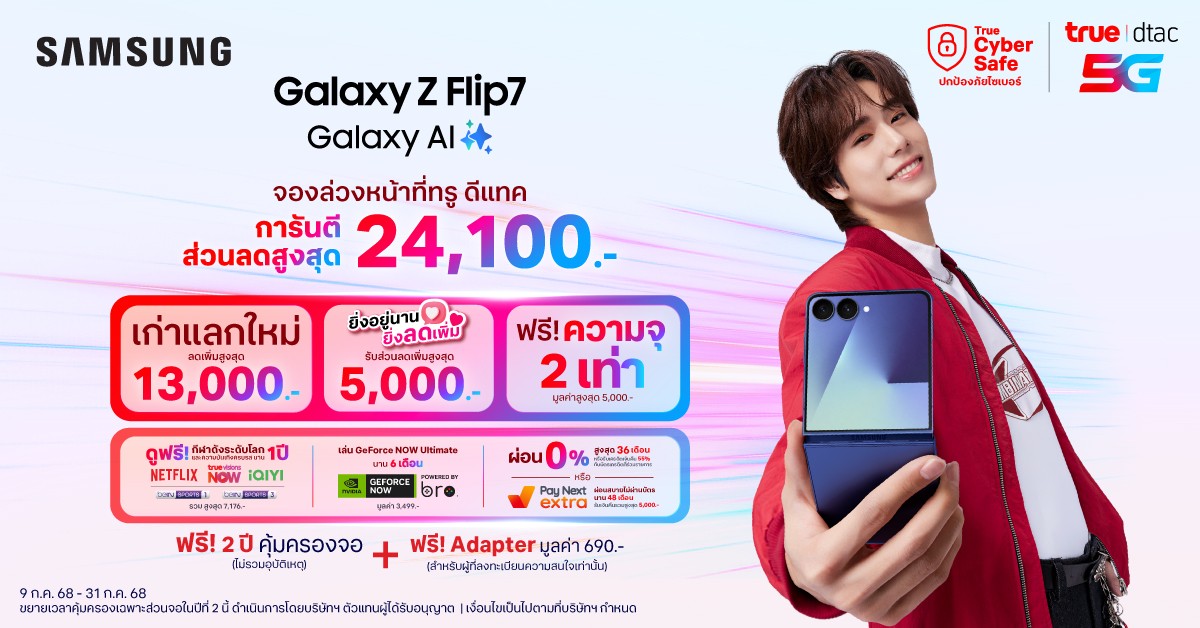 สาวกซัมซุงสามารถจองได้ ตั้งแต่วันนี้ถึง 31 กรกฏาคมนี้ ที่ทรูช็อป ดีแทคช็อป ทรูสเฟียร์ ทุกสาขา Line @Truestore / FB Truestore และช่องทางออนไลน์ https://deal.true.th/samsung/galaxy-z-series-flip7-fold7.html พร้อมเปิดตัว “ภูวินทร์ ตั้งศักดิ์ยืน” Co Presenter และภาพยนตร์โฆษณา ชุด Samsung Galaxy Z Fold7 x Phuwin https://vt.tiktok.com/ZSBmsPWNS/ และ Samsung Galaxy Z Flip7 x Phuwin https://vt.tiktok.com/ZSBmG3A9n/