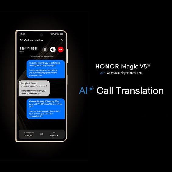 โลกการทำงานและการสื่อสารกำลังเปลี่ยนไปอย่างรวดเร็ว HONOR Magic V5 มาพร้อม Advance AI ผู้ช่วยอัจฉริยะ ที่ทำให้ทุกการสื่อสาร การแปลภาษา และการจัดการข้อมูลเป็นเรื่องง่าย และทันสมัยยิ่งขึ้น