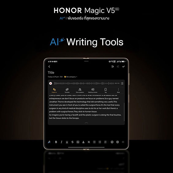 HONOR Magic V5 มาพร้อม Advance AI Writing Tools พัฒนาร่วมกับ Google Gemini ให้ผู้ใช้สร้างเนื้อหาตามต้องการได้ทันที ผ่านการป้อนข้อความหรือคำสั่ง ฟีเจอร์รองรับการใช้งานหลายรูปแบบ อาทิ Smart Creation สร้างสรรค์เนื้อหาอัตโนมัติ Polishing and Rewriting ปรับปรุงหรือเขียนใหม่ให้เนื้อหาไหลลื่นCorrection ตรวจสอบและแก้ไขข้อความ Advance AI Check Spelling and Grammar ตรวจแกรมม่าและไวยากรณ์หลายภาษา และ Advance AI Rewrite Style ช่วยปรับแต่งพารากราฟหรือบทความให้เป็นสไตล์ใหม่แบบแอดวานซ์ ฟีเจอร์เหล่านี้ช่วยให้ผู้ใช้ทำงานด้านการเขียนได้ รวดเร็ว สร้างสรรค์ และมีประสิทธิภาพมากขึ้น