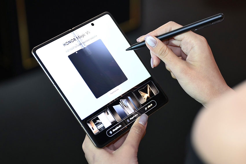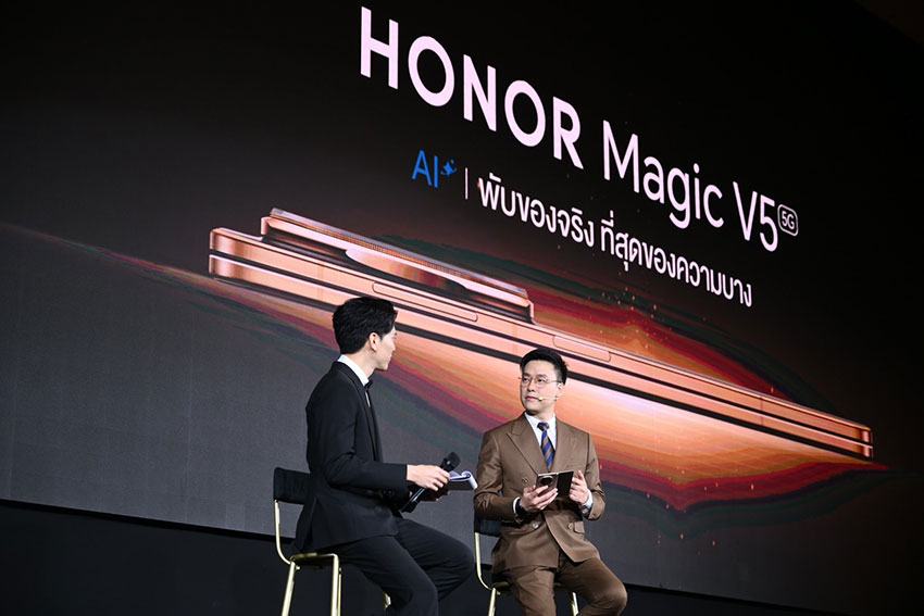 ด้าน นายพลภัทร์ สายบัวทอง ประธานเจ้าหน้าที่ฝ่ายปฏิบัติการ บริษัท ออเนอร์ ประเทศไทย กล่าวเสริมว่า “วันนี้ผมภูมิใจที่จะประกาศว่า เราทำสำเร็จแล้วกับการเปิดตัว HONOR Magic V5 อุปกรณ์ที่ไม่ใช่เพียงสมาร์ตโฟนจอพับ แต่คือนิยามใหม่ของอุตสาหกรรม ด้วยการเป็นสมาร์ตโฟนจอพับที่ทั้งบางและเบาที่สุด ซึ่งเกิดจากการผสานเทคโนโลยีหลัก 3 ประการเข้าด้วยกันอย่างลงตัว ได้แก่ เทคโนโลยีแบตเตอรี่ขั้นสูง ที่พัฒนาสถาปัตยกรรมใหม่ให้เล็กลงแต่ยังคงทรงพลัง การผลิตที่ขับเคลื่อนด้วย AI ช่วยเพิ่มความแม่นยำตั้งแต่การเลือกวัสดุจนถึงการประกอบและควบคุมคุณภาพ ทำให้แข็งแกร่งและเชื่อถือได้ วัสดุใหม่เพื่ออนาคต ที่ทั้งแข็งแรง ทนทานต่อการพับ และมีน้ำหนักเบา ทำให้พกพาสะดวกยิ่งกว่าเดิม”