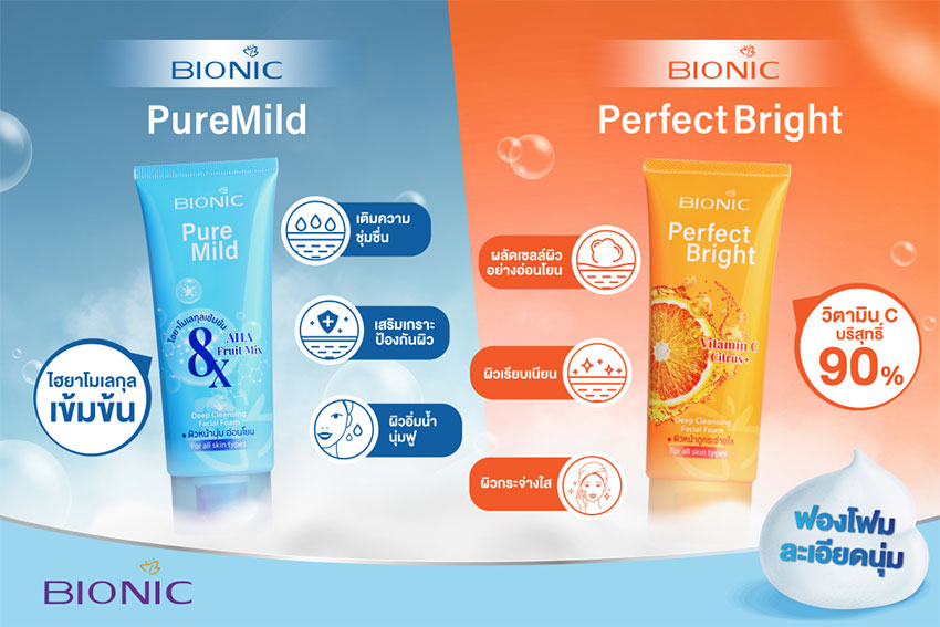 BIONIC Facial Foam มีให้เลือก 2 สูตรตามสภาพผิว ได้แก่ BIONIC Facial Foam สูตร Perfect Bright– ช่วยให้ผิวกระจ่างใส เรียบเนียนน่าสัมผัส ด้วยส่วนผสมของวิตามินซีบริสุทธิ์เข้มข้น 90% ร่วมกับสารสกัดจาก Citrus, Marine White และ Niacinamide ช่วยผลัดเซลล์ผิวอย่างอ่อนโยน ลดเลือนจุดด่างดำและความหมองคล้ำ พร้อมเทคโนโลยี Micro Bubble Cleanser ทำความสะอาดล้ำลึกถึงรูขุมขน พร้อมล็อกความชุ่มชื้นให้ผิวเนียนนุ่มยิ่งขึ้น