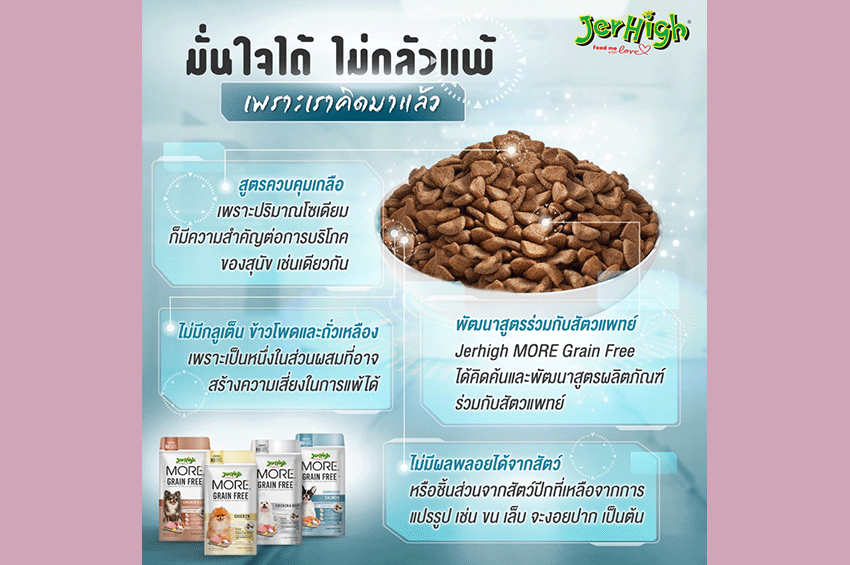 จุดเด่นของ Jerhigh More Grain-Free คือ ลดความเสี่ยงอาการแพ้และช่วยส่งเสริมสุขภาพของสุนัข บริษัทฯ นำผลิตภัณฑ์ไปทดสอบกับสุนัขพันธุ์เล็กจากฟาร์มอายุ 1-4 ปี เป็นเวลาติดต่อกัน 14 วัน ผลลัพธ์ที่ได้ ขนสวย สุขภาพดีขึ้น 90%, คราบน้ำตาลดลง 80%, รูปร่างสมส่วนขึ้น 93%, ขับถ่ายเป็นก้อน กลิ่นไม่แรง 100% และที่สำคัญ รสชาติถูกปาก สุนัขชอบ 100% มาพร้อมกับความอร่อยหลากหลายรสชาติ ได้แก่ 1. สูตรไก่ 2. สูตรไก่และเนื้อ 3. สูตรไก่และตับ 4. สูตรแซลมอน ไม่มีส่วนผสมเนื้อไก่ เหมาะสำหรับสุนัขที่แพ้ไก่ สามารถติดตามรายละเอียดเพิ่มเติมหรือสั่งซื้อได้ที่ Facebook Fanpage : jerhighofficial , Line My Shop : @jerhighfordog หรือ http://www.jerhigh.com/