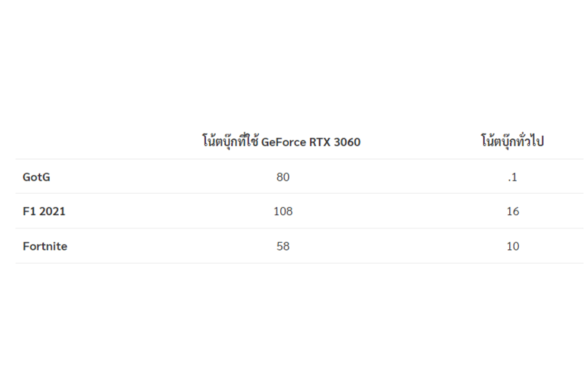 ทางด้านประสิทธิภาพการเล่นเกม RTX ON (Ray Tracing & DLSS) ที่พร้อมใช้งาน สำหรับโน้ตบุ๊กทั่วไปจะไม่มีความสามารถดังกล่าวเหมือนกราฟิกจาก NVIDIA จะสนับสนุนให้ได้ กราฟิกที่อยู่ใน Intel Core i7 เทียบกับกราฟิก GeForce 3060 (60W/TGP) เฟรมเฉลี่ยต่อวินาทีที่ 1080p (Full HD) การตั้งค่าคุณภาพสูง, High Ray Tracing, โหมดคุณภาพ DLSS การตั้งค่า Fortnite: 1080p, Epic Preset, DLSS Balanced, RT On: RT Shadows On, Reflections/AO Medium, GI Low