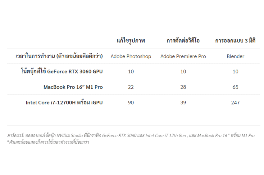 สำหรับฮาร์ดแวร์ที่ทดสอบบนโน้ตบุ๊ก NVIDIA Studio ที่มีกราฟิก GeForce RTX 3060 และ Intel Core i7 12th Gen , และ MacBook Pro 16” พร้อม M1 Pro และซอฟต์แวร์ที่ Blender 3.1 เกณฑ์มาตรฐาน Open Data พร้อมเครื่องมือแสดงผล OptiX และ Metal (ตามลำดับ) การทดสอบการ Export ไฟล์ Adobe Premiere Pro ผ่าน Adobe Media Encoder 14.3.2 โดยใช้ลำดับ 4K ต่างๆ ร่วมกับชุดค่าผสมทั่วไป เอฟเฟกต์ ประสิทธิภาพของ Adobe Photoshop 23.1.1 ใช้เอฟเฟกต์ขั้นสูงกับรูปภาพ RAW ที่ความละเอียดต่างๆ