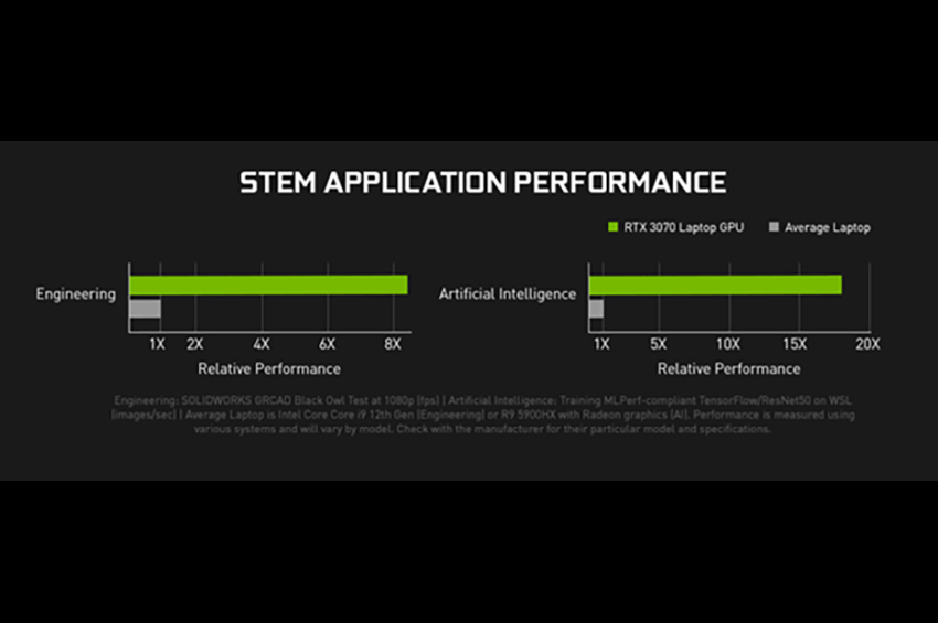 ทั้งนี้โน้ตบุ๊กที่ใช้กราฟิก GeForce สามารถเร่งความเร็วแอปพลิเคชั่นชั้นนำที่ใช้งานในด้านวิศวกรรม วิทยาการคอมพิวเตอร์ วิทยาศาสตร์ข้อมูล และเศรษฐศาสตร์ สิ่งนี้แปลเป็นการเรนเดอร์แบบเรียลไทม์เชิงโต้ตอบสำหรับการออกแบบและการจำลองส่วนประกอบที่ซับซ้อน การประมวลผลภาพและสัญญาณที่เร็วขึ้น และความสามารถในการพัฒนาแบบจำลอง AI และวิทยาศาสตร์ข้อมูลที่มีขนาดใหญ่ขึ้นและแม่นยำยิ่งขึ้น ด้วยการเร่งความเร็วจาก GPU นักเรียนในหลักสูตร STEM สามารถทำงานได้เร็วขึ้นและใช้เวลาในการเรียนรู้สิ่งต่าง ๆ ได้มากขึ้นและใช้เวลารอคอยที่น้อยลง