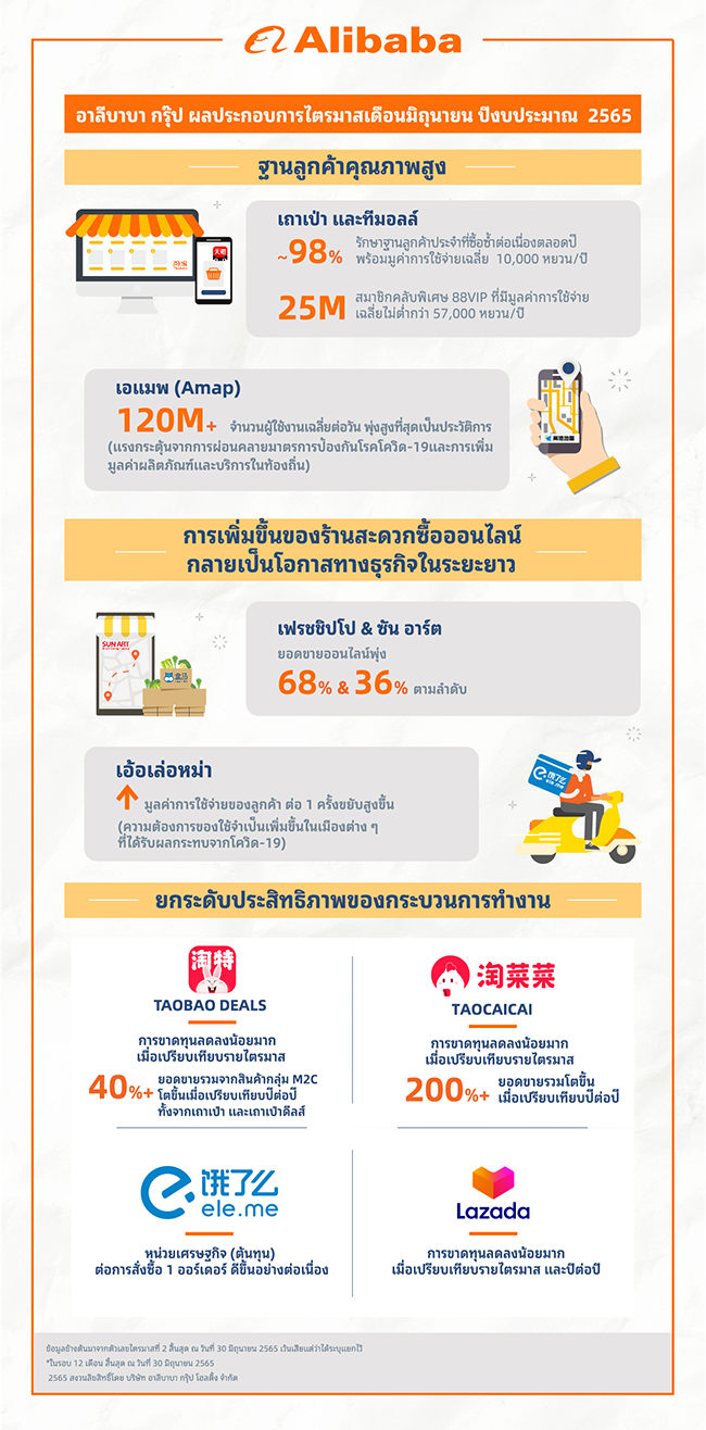 อาลีบาบา กรุ๊ป โฮลดิ้ง จำกัด (NYSE: BABA และ HKEX: 9988, “อาลีบาบา” หรือ “อาลีบาบา กรุ๊ป”) ประกาศผลประกอบการทางการเงินสำหรับไตรมาสเดือนมิถุนายน ซึ่งสิ้นสุด ณ วันที่ 30 มิถุนายน 2565 ที่ผ่านมา