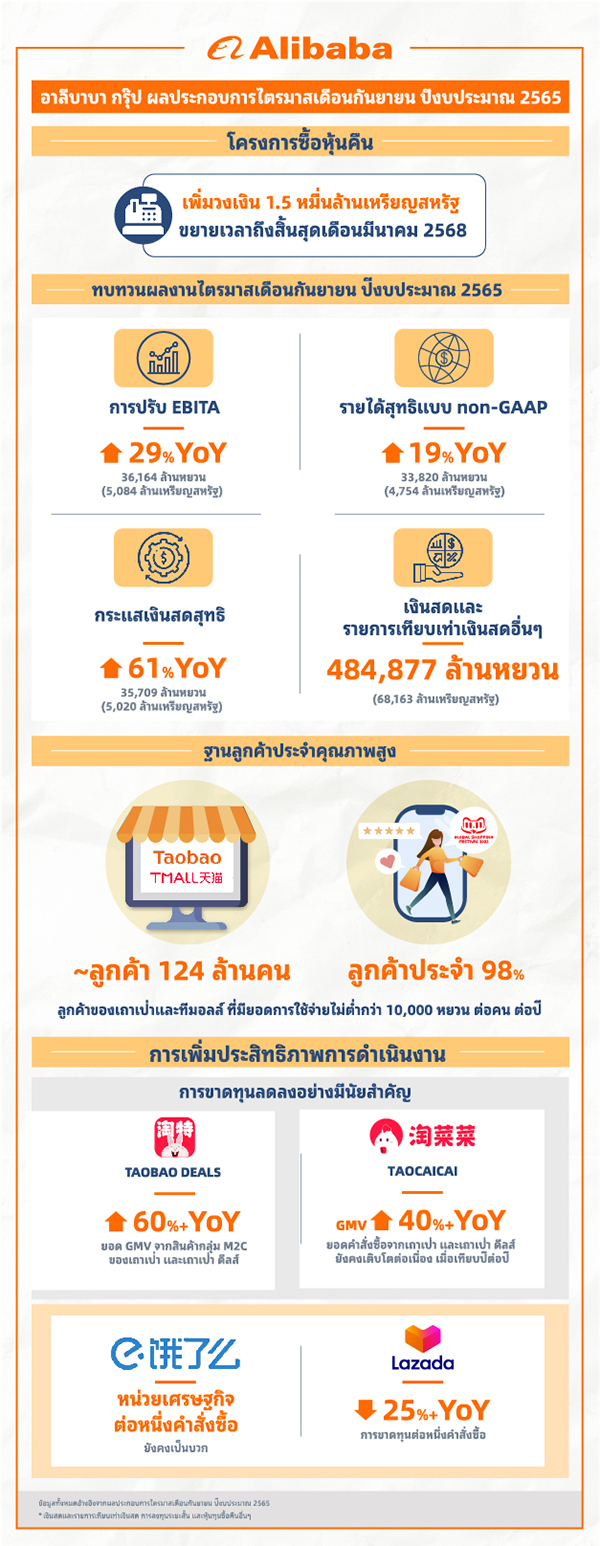 “ถือเป็นอีกหนึ่งไตรมาสที่เราสามารถสร้างการเติบโตของรายได้ที่ดี ซึ่งเติบโตขึ้นกว่า 3% เมื่อเทียบเป็นรายปี แม้จะต้องเผชิญกับผลกระทบจากอุปสงค์การบริโภคในช่วงหลังการฟื้นตัวของโควิด-19 ในประเทศจีน และสถานการณ์การค้าข้ามพรมแดนที่ชะลอตัวลง เนื่องจากต้นทุนด้านโลจิสติกส์ที่สูงขึ้นและความผันผวนของสกุลเงินต่างประเทศ” ซู หง ประธานเจ้าหน้าที่ฝ่ายการเงินของอาลีบาบา กรุ๊ป กล่าว “เรายังคงยึดวิธีการบริหารงานโดยพิจารณาองค์ประกอบจากทุกมิติ เพื่อปรับปรุงประสิทธิภาพการดำเนินงาน และการจัดการต้นทุนทางธุรกิจที่เหมาะสม ซึ่งส่งผลให้ กำไรก่อนหักค่าเสื่อมราคา (EBITA) ที่ปรับแล้ว โตขึ้น 29% เมื่อเทียบเป็นรายปี นอกจากนี้ อ้างอิงข้อมูล ณ วันที่ 16 พฤศจิกายน 2565 ด้วยสถานะเงินสดสุทธิและกระแสเงินสดที่แข็งแกร่ง เราจึงได้ซื้อหุ้นคืนราว 1.8 หมื่นล้านเหรียญสหรัฐ ภายใต้โครงการซื้อหุ้นคืน วงเงิน 2.5 หมื่นล้านเหรียญสหรัฐ ที่เราได้ดำเนินการอยู่ ทั้งนี้ คณะกรรมการของเราได้อนุมัติให้มีการขยายโครงการซื้อหุ้นคืนอีก 1.5 หมื่นล้านเหรียญสหรัฐ และขยายโครงการไปจนถึงสิ้นปีงบประมาณ 2568”
