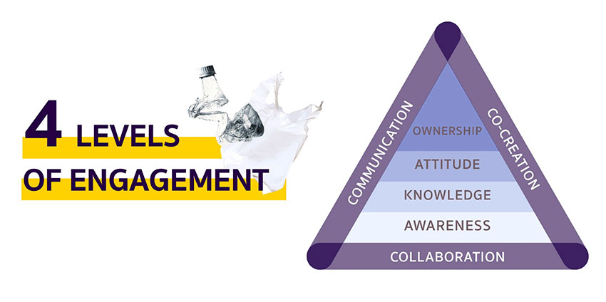 การทำให้เกิดการบริหารจัดการพลาสติกใช้แล้วตามหลักเศรษฐกิจหมุนเวียน ต้องอาศัยการดำเนินการร่วมกันจากหลายภาคส่วนที่เกี่ยวข้อง โดยเฉพาะอย่างยิ่งการสร้างความตระหนักด้านสิ่งแวดล้อมเพื่อให้ทุกคนมีส่วนร่วมดูแลรักษาสิ่งแวดล้อมสามารถอธิบายได้ด้วยแนวคิดการสร้างความมีส่วนร่วม (Engagement) 4 ระดับโดยมีรายละเอียดดังนี้ (1) ความตระหนัก (Awareness) (2) ความรู้ความเข้าใจ (Knowledge) (3) ทัศนคติ (Attitude) และ (4) ความรู้สึกเป็นเจ้าของ (Ownership) ทั้งนี้ หลักการมีส่วนร่วมทั้ง 4 ขั้น จำเป็นต้องเกิดควบคู่ไปกับ “หลัก 3C” ได้แก่ การร่วมมือ (collaboration) การสื่อสารเพื่อสร้างความรู้ความเข้าใจ (communication) และการลงมือปฏิบัติและความพร้อมที่จะสร้างสิ่งต่าง ๆ ร่วมกัน (co-creation)