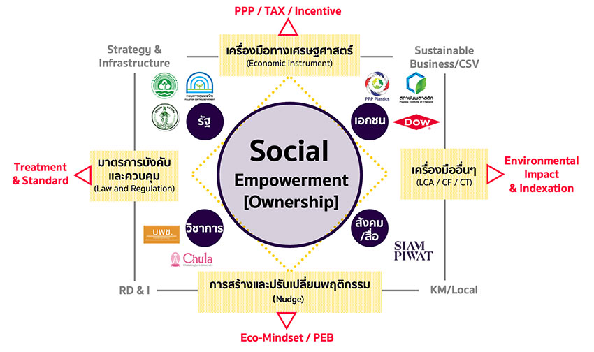 หลักการมีส่วนร่วมทั้ง 4 ขั้นในข้างต้นสามารถเกิดได้ 2 แนวทาง คือ ลำดับจากข้อ (1) ถึง (4) ตามที่ได้กล่าวมาจะเรียกว่า “แนวทางแบบด้านล่างขึ้นด้านบน (bottom-up)” ซึ่งสอดคล้องกับการดำเนินงานของโครงการวิจัยนี้ และ “แนวทางแบบด้านบนลงด้านล่าง (top-down)” ผ่านความร่วมมือของหน่วยงานต่าง ๆ เพื่อให้เกิด “eco mindset” โดยมุ่งเน้นการทำให้เกิดความรู้สึกเป็นเจ้าของ (Ownership) หรือการเสริมสร้างพลังทางสังคม (Social Empowerment) โดยอาศัยความร่วมมือจากหน่วยงานภาคส่วนที่เกี่ยวข้องในการผลักดันการดำเนินโครงการ ทั้ง 4 ภาคส่วน โดยประกอบด้วย ภาคสังคม/สื่อ ภาคเอกชน ภาควิชาการ และภาครัฐ โดยกรมส่งเสริมคุณภาพสิ่งแวดล้อม กรมควบคุมมลพิษ และสำนักสิ่งแวดล้อมกรุงเทพมหานคร ได้ร่วมเป็นภาคีเครือข่ายในการสร้างความร่วมมือและการสื่อสารเพื่อสร้างพฤติกรรมที่เป็นมิตรต่อสิ่งแวดล้อมของโครงการนี้ ซึ่งมุ่งเน้นการบริหารจัดการพลาสติกอย่างยั่งยืนในเขตพื้นที่เมืองชั้นใน นอกจากนี้ยังมีโครงการอื่น ๆ ที่ดำเนินการในรูปแบบแนวทางแบบด้านบนลงด้านล่างเช่นกัน ตัวอย่างเช่น โครงการชุมชนปลอดขยะสู่ความยั่งยืน (โครงการสะอาดบุรี) ที่ดำเนินการภายใต้ความร่วมมือของกรมส่งเสริมคุณภาพสิ่งแวดล้อมและองค์การกระจายเสียงและแพร่ภาพสาธารณะแห่งประเทศไทย โดยมุ่งเน้นให้คนในชุมชนท้องถิ่นตระหนักถึงสิ่งแวดล้อมและความยั่งยืนของชุมชน ซึ่งเป็นแนวปฏิบัติที่ดี (best practice) รวมถึงสามารถเชื่อมโยงและบูรณาการการจัดการองค์ความรู้ที่เกี่ยวข้องได้ ทั้งนี้ สามารถติดตามข้อมูลข่าวสารเพิ่มเติมได้ทาง Facebook page กรมส่งเสริมคุณภาพสิ่งแวดล้อม หรือทาง https://deqp.go.th