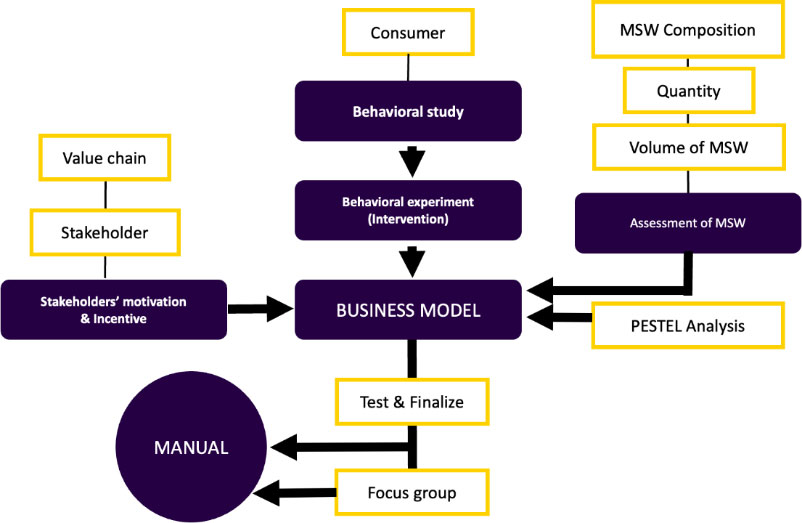 การทำความเข้าใจภาพรวมของธุรกิจในการจัดการขยะ จำเป็นที่จะต้องศึกษาปัจจัยที่ส่งผลกระทบกับธุรกิจมีมีผลเป็นทั้งโอกาสและอุปสรรค โดยอาศัยแนวคิด PESTEL analysis ซึ่งใช้ในการวิเคราะห์สภาพแวดล้อมมหภาคของธุรกิจสำหรับการศึกษาแบบแผนธุรกิจเพื่อความยั่งยืน (Sustainable business model)[2] โดยประกอบด้วยปัจจัยด้านการเมือง (Political) เศรษฐกิจ (Economical) สังคม (Social) เทคโนโลยี (Technological) สิ่งแวดล้อม (Environmental) และกฎหมาย (Legal) ซึ่งจะทำให้เห็นถึงโอกาสทางธุรกิจที่เป็นไปได้ และข้อจำกัดหรืออุปสรรคในการประกอบธุรกิจของจากสภาพแวดล้อมในพื้นที่เป้าหมาย รวมถึงการวิเคราะห์หารูปแบบแบบแผนธุรกิจในการจัดการขยะที่เหมาะสมกับพื้นที่นั้นต้องทำความเข้าใจความสัมพันธ์ของผู้ที่มีส่วนเกี่ยวข้องทั้งหมด เพื่อหาแนวทางสร้างการร่วมพันธมิตรของกลุ่มต่าง ๆ และนำไปสู่การออกแบบแบบแผนธุรกิจที่ได้รับการยอมรับจากทุกภาคส่วนในธุรกิจการจัดการขยะ