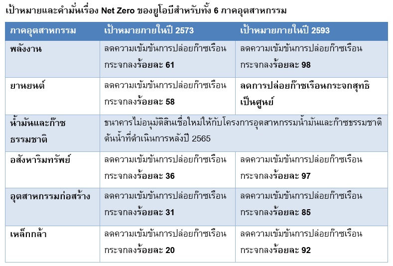 คำมั่นของยูโอบีครอบคลุม 6 ภาคอุตสาหกรรม อันได้แก่ พลังงาน ยานยนต์ น้ำมันและก๊าซธรรมชาติ ซึ่งเป็นส่วนหนึ่งของห่วงโซ่ด้านพลังงาน รวมถึงอสังหาริมทรัพย์ อุตสาหกรรมก่อสร้าง และเหล็กกล้า ซึ่งเป็นส่วนหนึ่งของห่วงโซ่คุณค่าด้านสิ่งแวดล้อมสรรค์สร้าง โดยทั้ง 6 ภาคอุตสาหกรรมนี้คิดเป็นร้อยละ 60 ของพอร์ตโฟลิโอสินเชื่อลูกค้าธุรกิจของธนาคาร