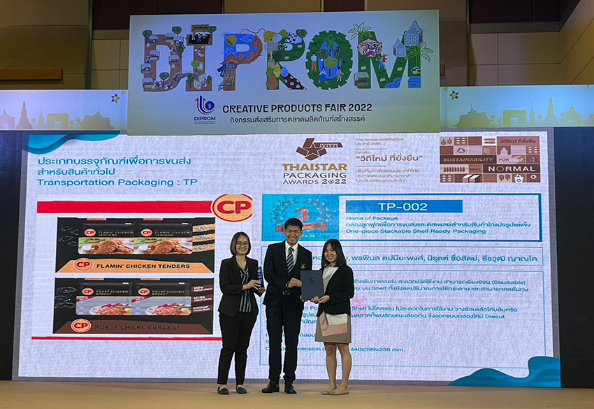 ประเภทผู้ประกอบการ ด้านบรรจุภัณฑ์สำหรับขนส่งสินค้า (Transportation Packaging) จากกรมส่งเสริมอุตสาหกรรม กระทรวงอุตสาหกรรม จากกล่องบรรจุผลิตภัณฑ์ไก่แปรรูปแช่แข็ง Flamin Chicken Tenders ที่ช่วยลดปริมาณการใช้กระดาษ ตอกย้ำความมุ่งมั่นเป็นองค์กรขับเคลื่อนธุรกิจที่เป็นมิตรต่อสิ่งแวดล้อม ใช้นวัตกรรมบรรจุภัณฑ์ที่ลดการใช้ทรัพยากร ควบคู่กับการปกป้องและรักษาความปลอดภัยอาหาร เพื่อส่งมอบผลิตภัณฑ์อาหารปลอดภัย และลดการสูญเสียอาหารตลอดห่วงโซ่คุณค่ากับผู้บริโภคทั่วโลก