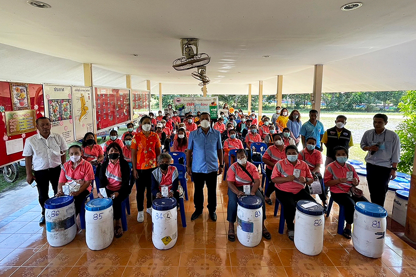 ส่วนที่ ศูนย์ปรับปรุงพันธุกรรมกุ้งซีพีเอฟ ปะทิว จ.ชุมพร ร่วมกับ เทศบาลตำบลบางสน อ.ปะทิว จ.ชุมพร จัดทำ “โครงการถังขยะเปียกลดโลกร้อน" หรือ “ถังหมัก รักษ์ดิน” เพื่อกําจัดขยะอินทรีย์ที่เกิดขึ้นภายในครัวเรือน ซึ่งได้เริ่มทำการชี้แจงวัตถุประสงค์ของโครงการฯ และลงทะเบียนรับถังหมักรักษ์โลก พร้อมรับเชื้อจุลินทรีย์ (พด.6) นำร่องในกลุ่มพนักงานซีพีเอฟที่มีภูมิลำเนาอยู่ในเขตตำบลบางสน รวม 75 ครัวเรือน ส่วนถังอีก 113 ใบ ส่งมอบให้กับ อสม. เขต1 และ อสม.เขต2 ซึ่งรับผิดชอบดูแลพื้นที่ตำบลบางสน ใน 7 หมู่ (หมู่ 1 2 3 4 5 6 และ 8) จำนวนที่มอบแล้วใน 3 เฟส รวมทั้งสิ้น 188 ชุด พร้อมจัดตั้งกลุ่มในแอปพลิเคชั่นไลน์ เพื่อรายงานผลและติดตามอย่างต่อเนื่อง
