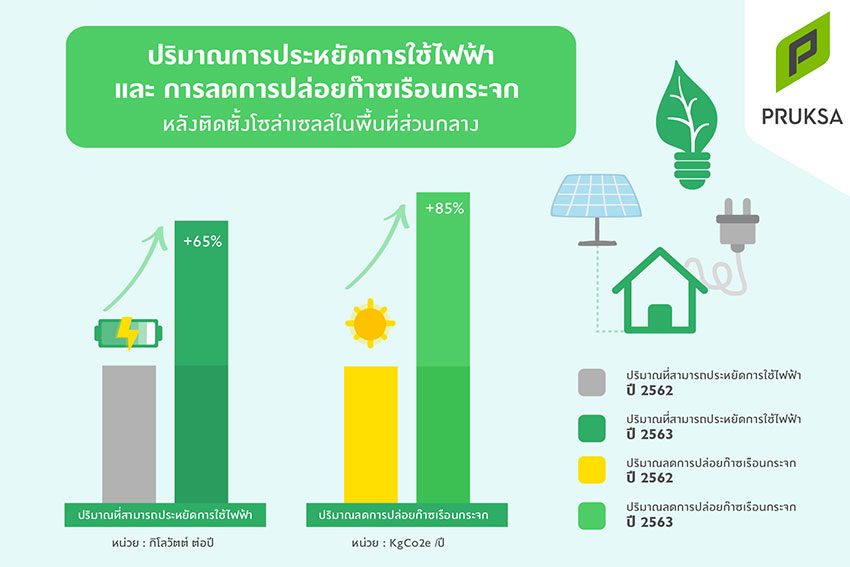 จากการเก็บข้อมูลในปี 2563 ที่ผ่านมา พบว่าในบ้านเดี่ยวและทาวน์เฮาส์ 12 โครงการ ที่ได้มีการติดตั้งแผงโซล่าเซลล์ในพื้นที่ส่วนกลางของโครงการ สามารถลดการปล่อยก๊าซเรือนกระจกไปได้ถึง 85% และ ประหยัดการใช้ไฟฟ้าไปได้ถึง 239,940 กิโลวัตต์ต่อปี  (คิดเป็น 62%)   ในปีนี้จึงมีแผนขยายการติดตั้งแผงโซล่าเซลล์ในพื้นที่ส่วนกลางของโครงการอย่างต่อเนื่อง แบ่งเป็นโครงการทาวน์เฮาส์ 13 โครงการ โครงการบ้านเดี่ยว 7 โครงการ พร้อมทั้งขยายการติดตั้งการใช้พลังงานสีเขียวนี้ไปยังโครงการคอนโดมิเนียมอีก 7 โครงการด้วย