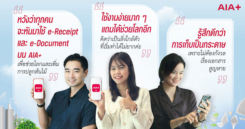 การชวนลูกค้าเปลี่ยนผ่านสู่บริการครบวงจรบนแอป AIA+ ในครั้งนี้ ไม่เพียงช่วยลดการใช้ทรัพยากรธรรมชาติ แต่ยังเพิ่มความสะดวกสบายให้ผู้ถือกรมธรรม์ ด้วยระบบการจัดการเอกสารที่ทันสมัยและปลอดภัย ผู้ถือกรมธรรม์สามารถเข้าถึงเอกสารสำคัญได้ทุกที่ทุกเวลา ไม่ว่าจะเป็นกรมธรรม์ ใบแจ้งยอดชำระเงิน ใบเสร็จรับเงิน และเอกสารเกี่ยวกับสินไหม ผ่านแอป AIA+ ที่มีระบบความปลอดภัยระดับสูง